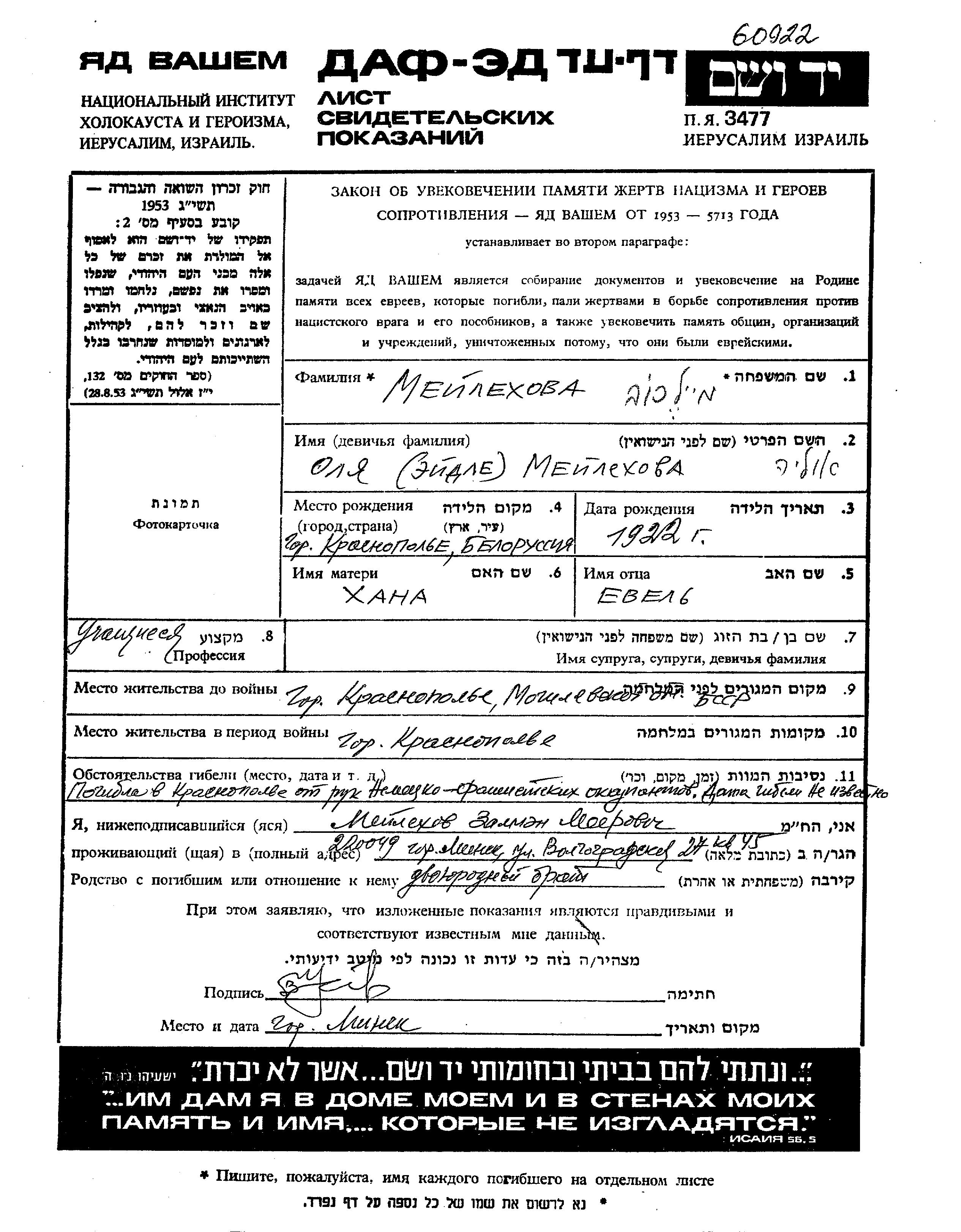 Meilekhova Olia Eidle 1922 Krasnopolye, Weißrussland (UdSSR) Gedenkblatt