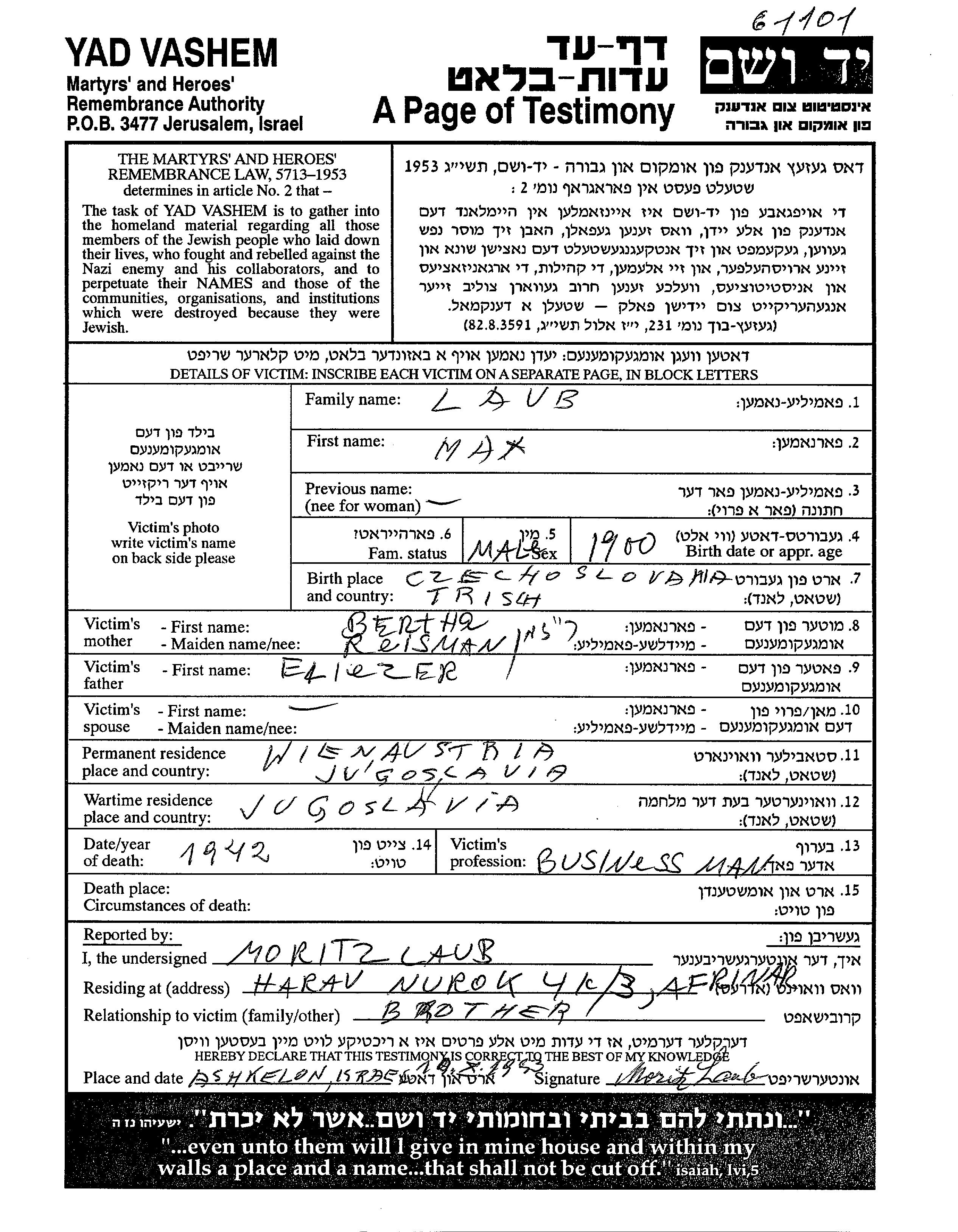 Max Laub wurde im Jahr 1900 in Trask, Tschechoslowakei geboren. Er war der Sohn von Elieser und Berta, geb. Reisman. Er war Geschäftsmann. Vor dem Zweiten Weltkrieg lebte er in Wien, Österreich. Während des Krieges war er in Jugoslawien.