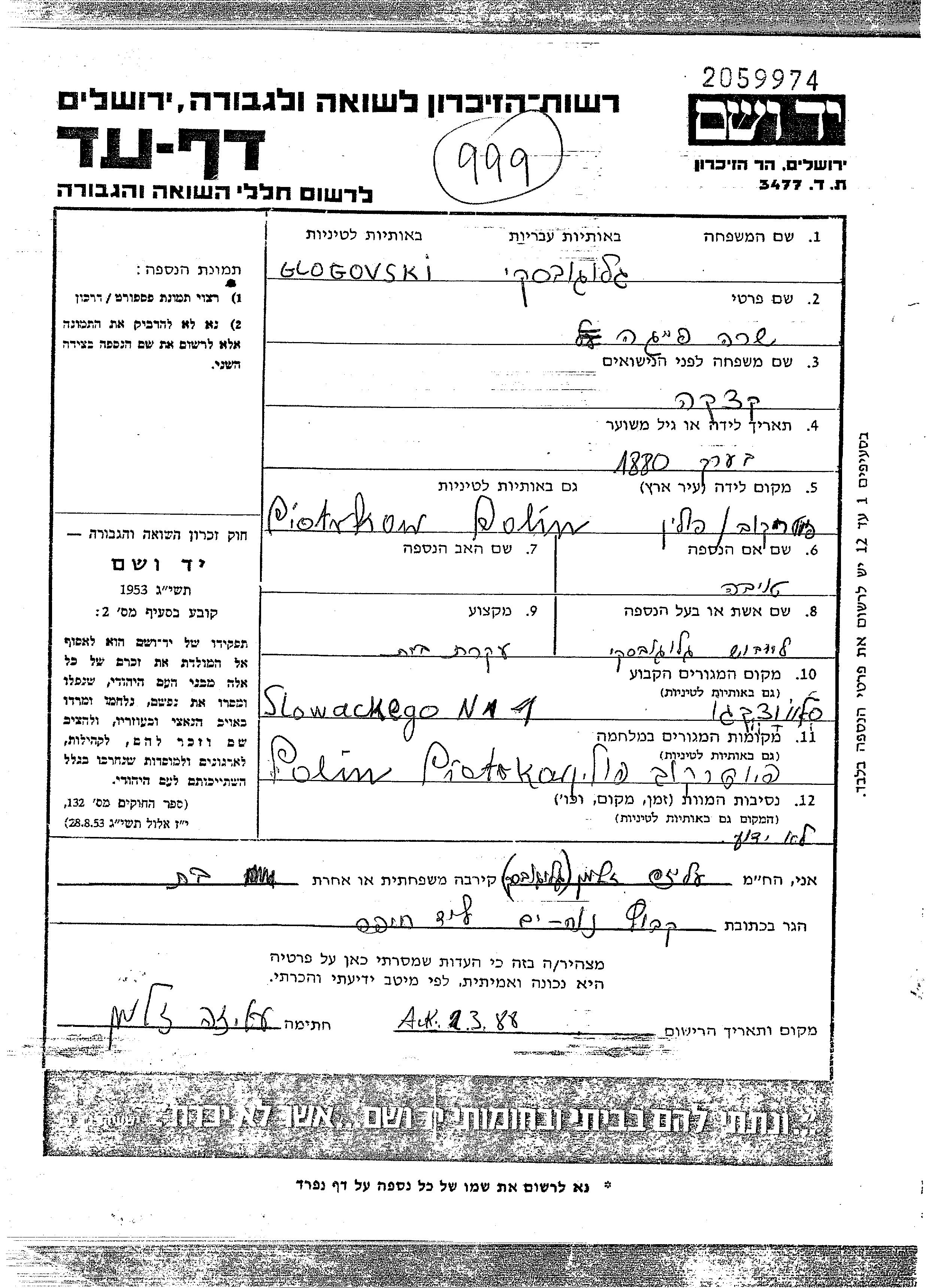 Sara Feiga Glogowski, geb. Kaczka wurde im Jahr 1880 in Piotrkow, Polen geboren. Sie war die Tochter von Toibe. Sie war Hausfrau und mit Leibush Verheiratet. Vor dem Zweiten Weltkrieg lebte sie in Piotrkow, Polen. Während des Krieges war sie in Piotrkow, Polen.