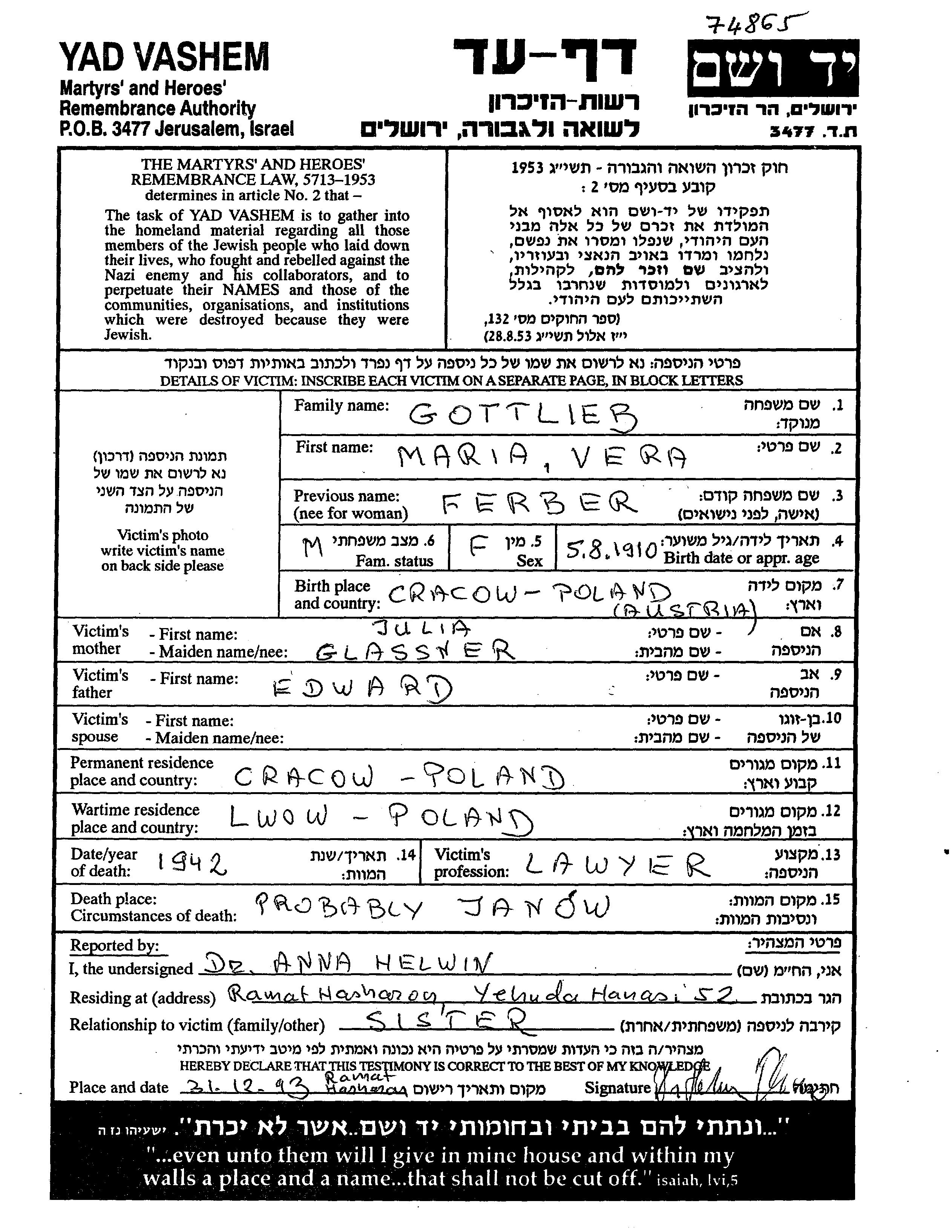 Maria Vera Gottlieb, geb. Ferber wurde im Jahr 1910 in Krakow, Polen geboren. Sie war die Tochter von Edward und Julia, geb. Glassner. Sie war Jurist und Verheiratet. Vor dem Zweiten Weltkrieg lebte sie in Krakow, Polen. Während des Krieges war sie in Lwow, Polen.