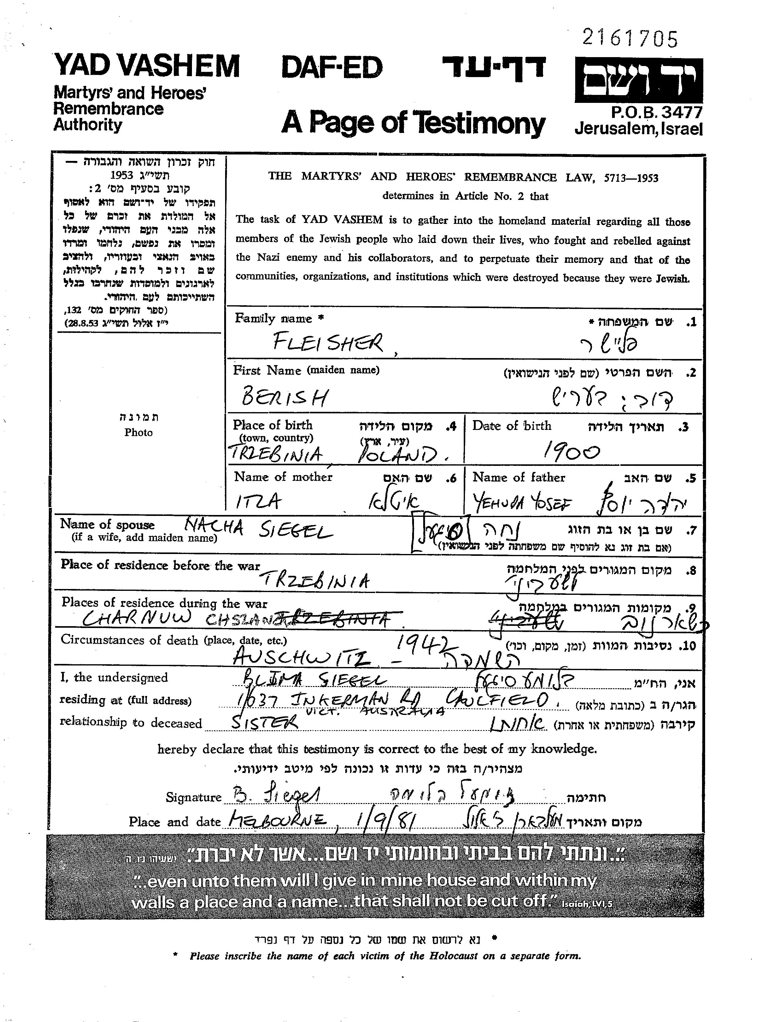 Dov Berish Fleischer wurde im Jahr 1900 in Trzebinia, Polen geboren. Er war der Sohn von Jehuda Josef und Itla. Er war mit Nacha Verheiratet. Vor dem Zweiten Weltkrieg lebte er in Trzebinia, Polen. Während des Krieges war er in Chrzanow, Polen.