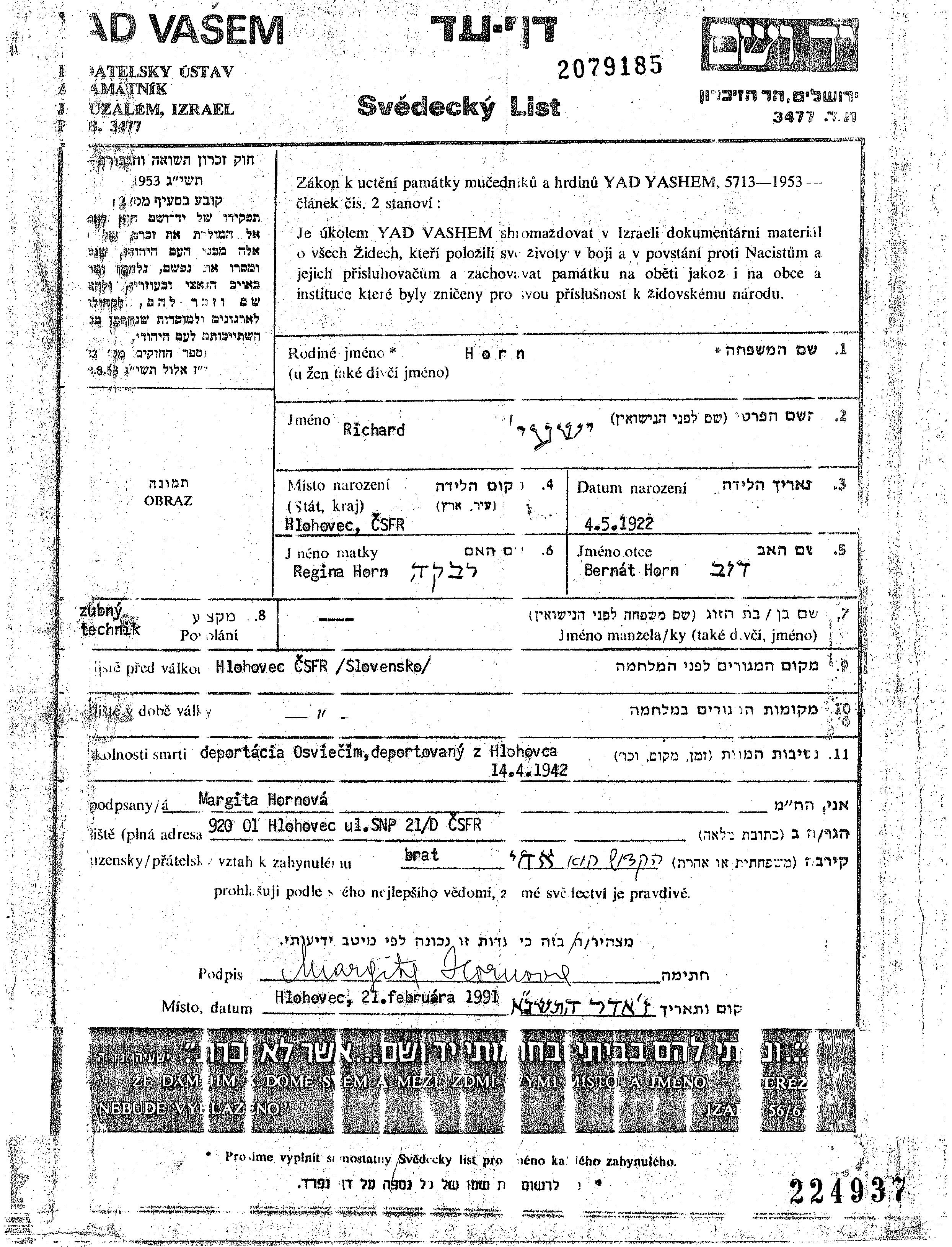 Richard Yshia Horn wurde im Jahr 1922 in Hlohovec, Tschechoslowakei geboren. Er war der Sohn von Bernat Dov und Rivka Regina, geb. Grünwald. Er war Zahntechniker/-in und Ledig. Vor dem Zweiten Weltkrieg lebte er in Hlohovec, Tschechoslowakei. Während des Krieges war er in Hlohovec, Tschechoslowakei.