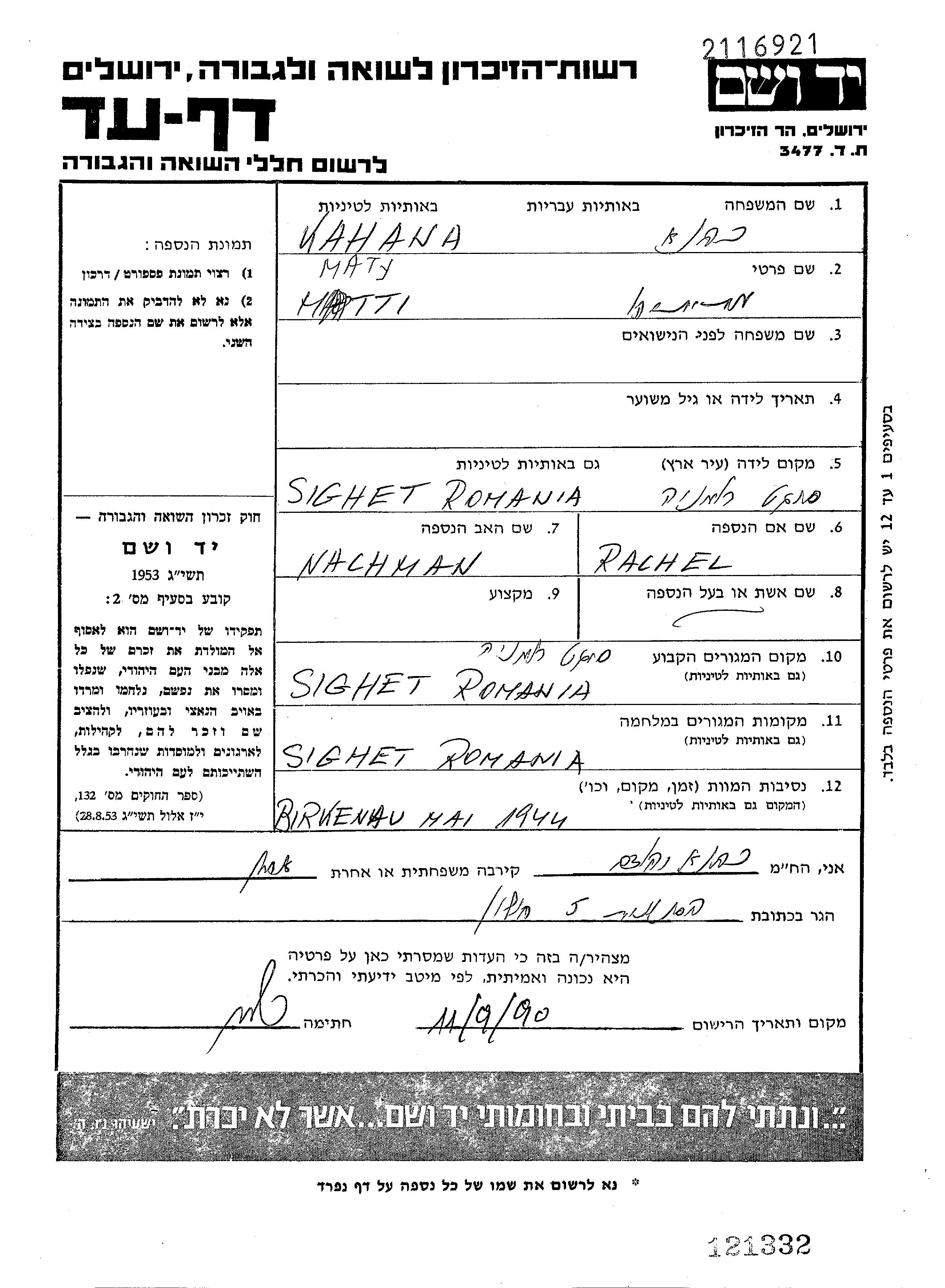 Kahana Maty Sighet, Rumänien Gedenkblatt