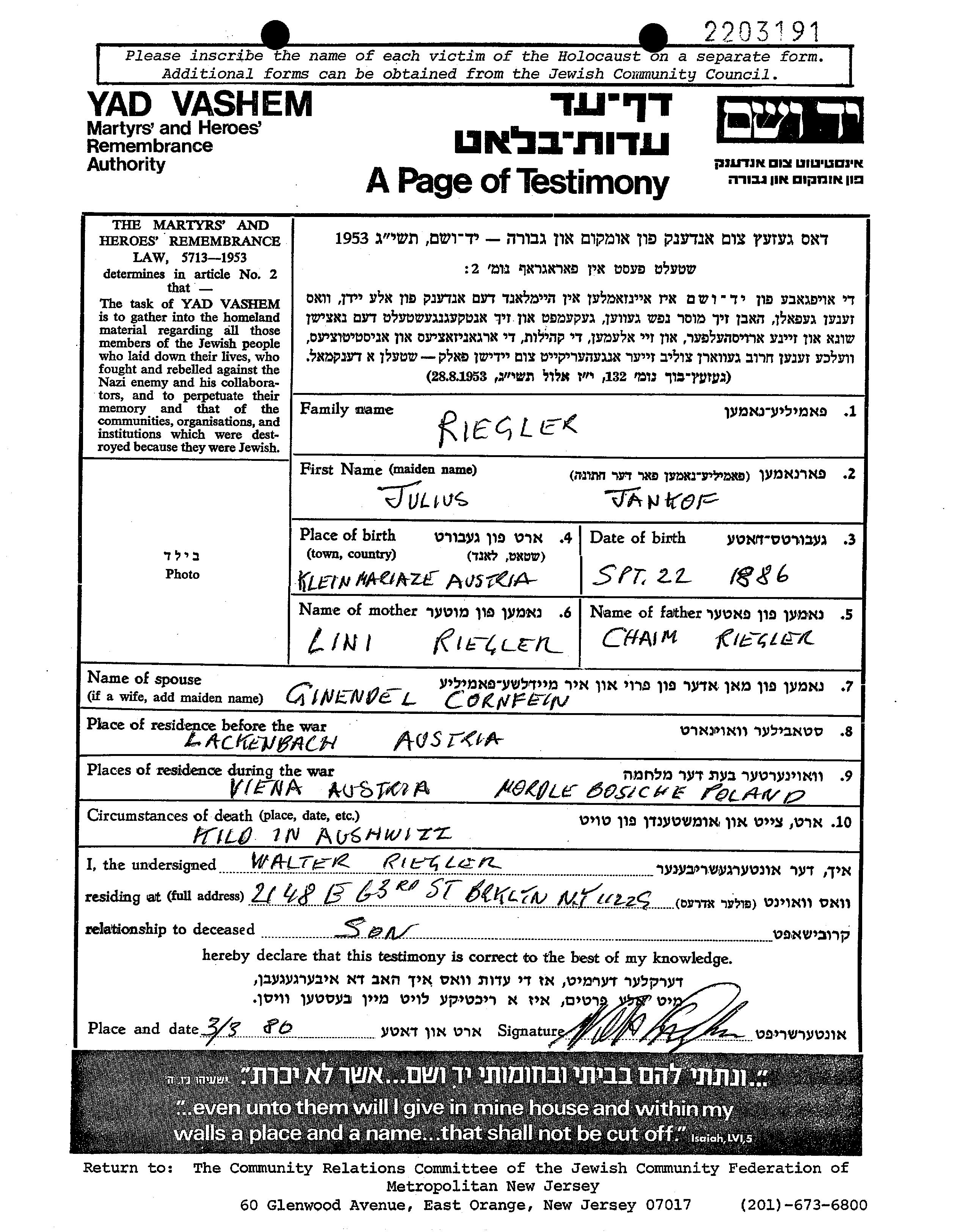 Jankof Julius Riegler wurde im Jahr 1886 in Klein Mariazell, Österreich geboren. Er war der Sohn von Khaim und Lini. Er war mit Ginendel Verheiratet. Vor dem Zweiten Weltkrieg lebte er in Lackenbach, Österreich. Während des Krieges war er in Wien, Österreich.