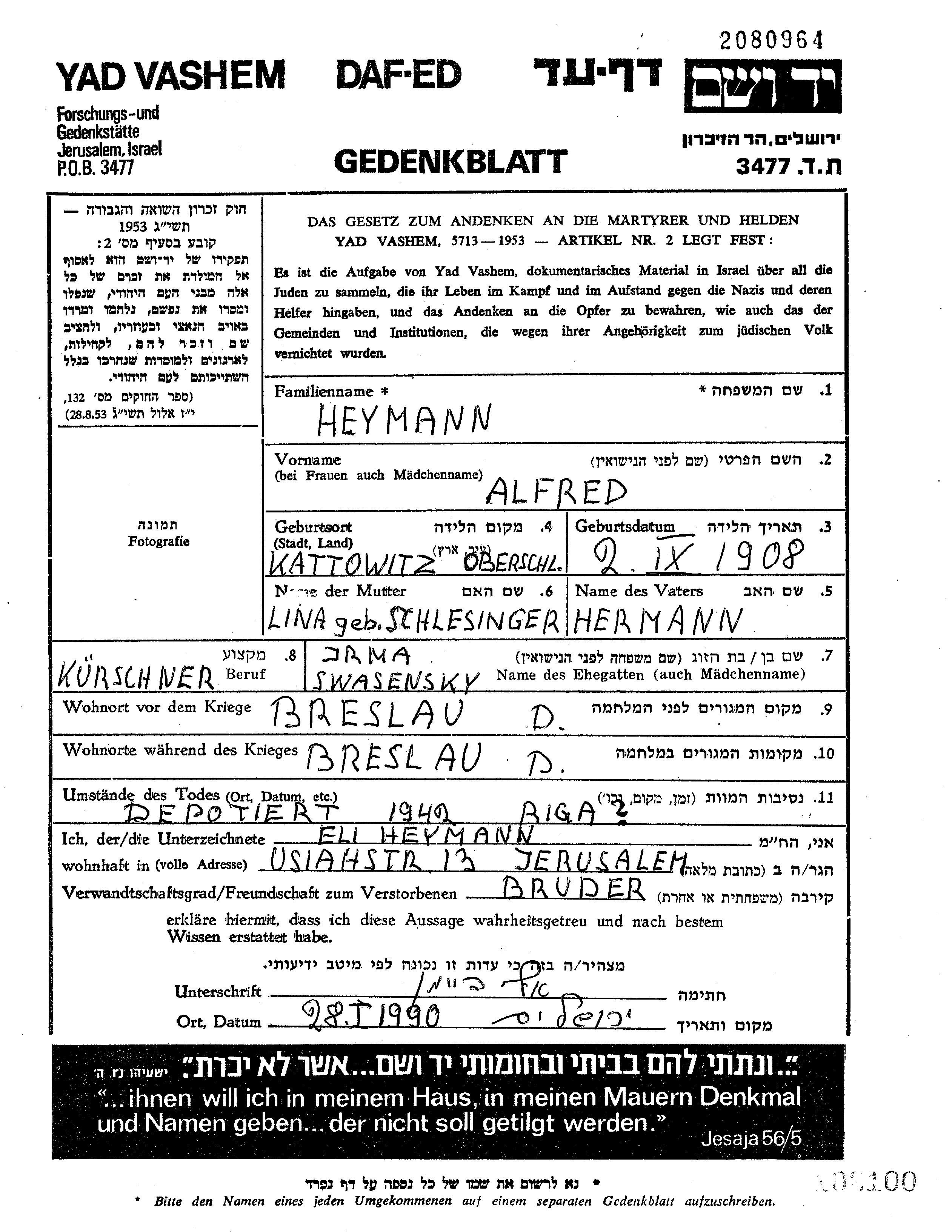 Alfred Heymann wurde im Jahr 1908 in Kattowitz, Polen geboren. Er war der Sohn von Hermann und Lina, geb. Schlesinger. Er war Kürschner/-in und mit Irma Verheiratet. Vor dem Zweiten Weltkrieg lebte er in Breslau, Deutsches Reich. Während des Krieges war er in Breslau, Deutsches Reich.