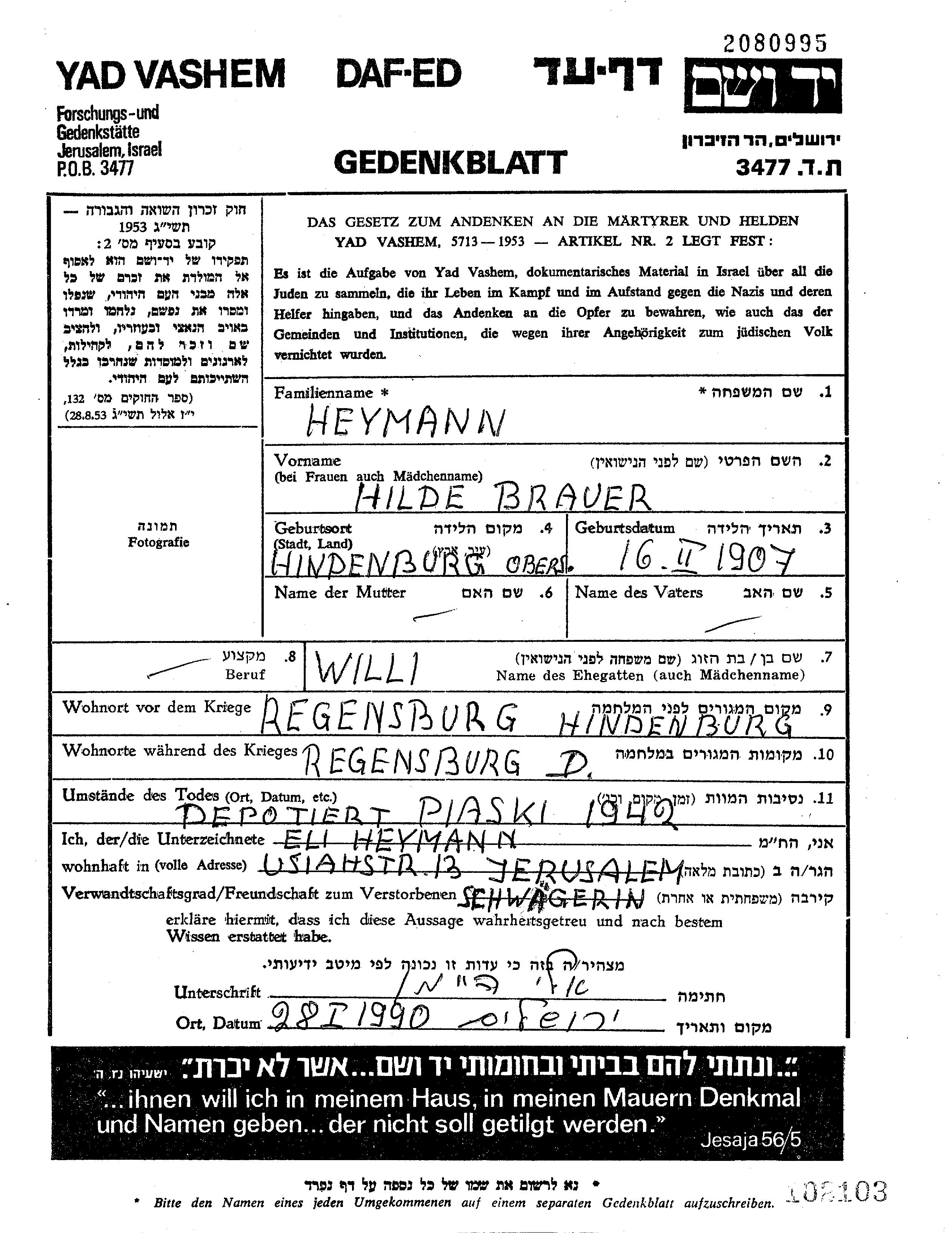Hilde Heymann, geb. Brauer wurde im Jahr 1907 in Hindenburg, Deutsches Reich geboren. Sie war mit Willi Verheiratet. Vor dem Zweiten Weltkrieg lebte sie in Hindenburg, Deutsches Reich. Während des Krieges war sie in Regensburg, Deutsches Reich.