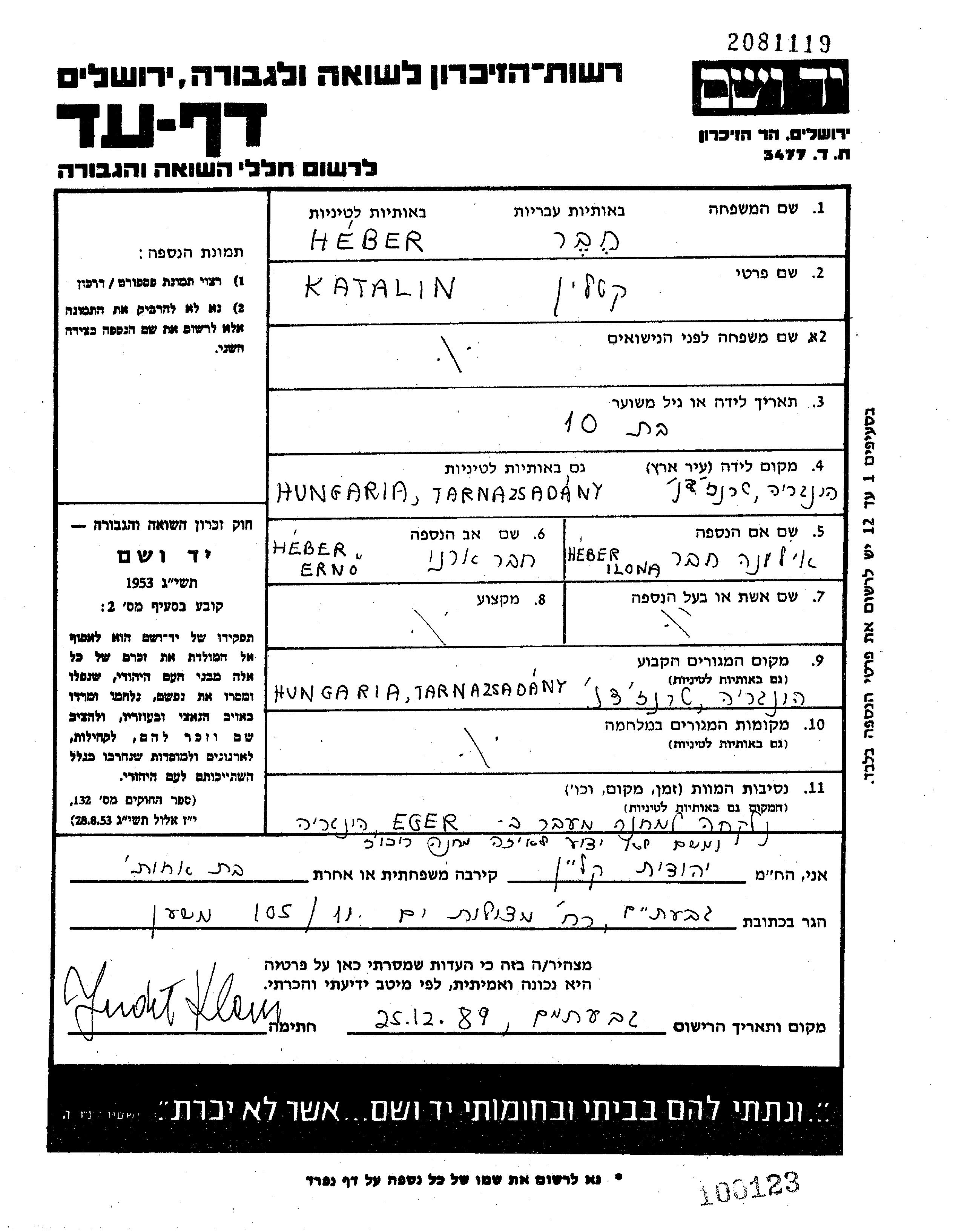 Katalin Heber wurde in Tarnazsadany, Ungarn geboren. Sie war die Tochter von Erno und Ilona, geb. Wertheimer. Sie war Kind. Vor dem Zweiten Weltkrieg lebte sie in Tarnazsadany, Ungarn. Während des Krieges war sie in Tarnazsadany, Ungarn.