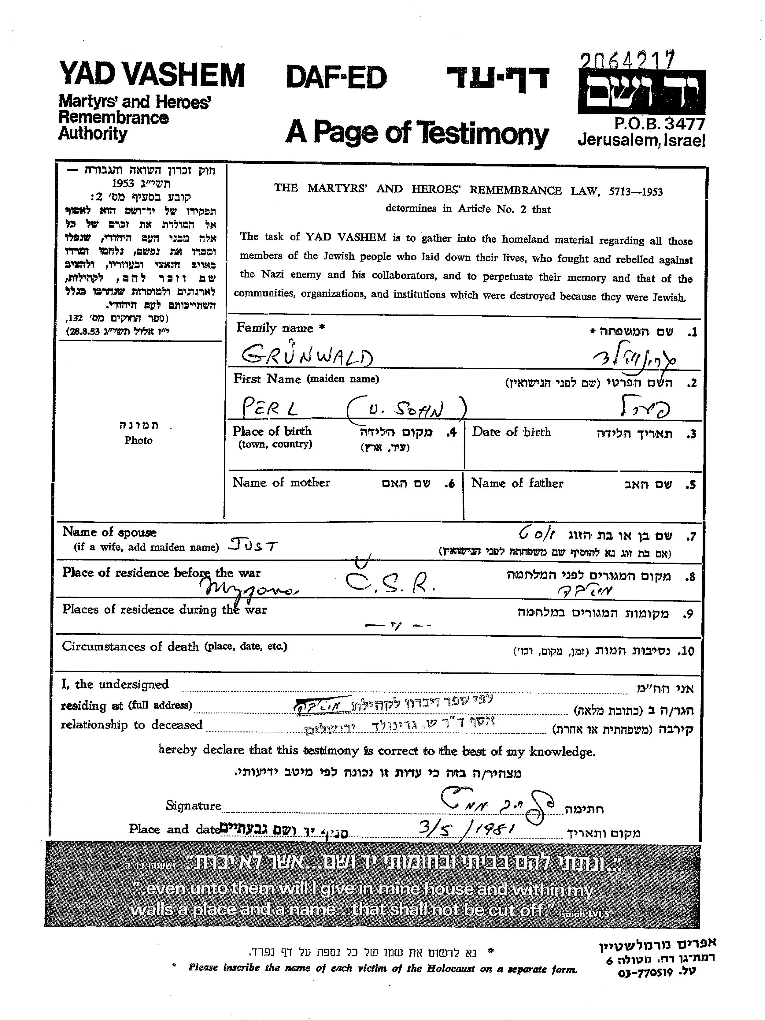 Perl Grünwald, geb. Just. Vor dem Zweiten Weltkrieg lebte sie in Myjava, Tschechoslowakei. Während des Krieges war sie in Myjava, Tschechoslowakei.