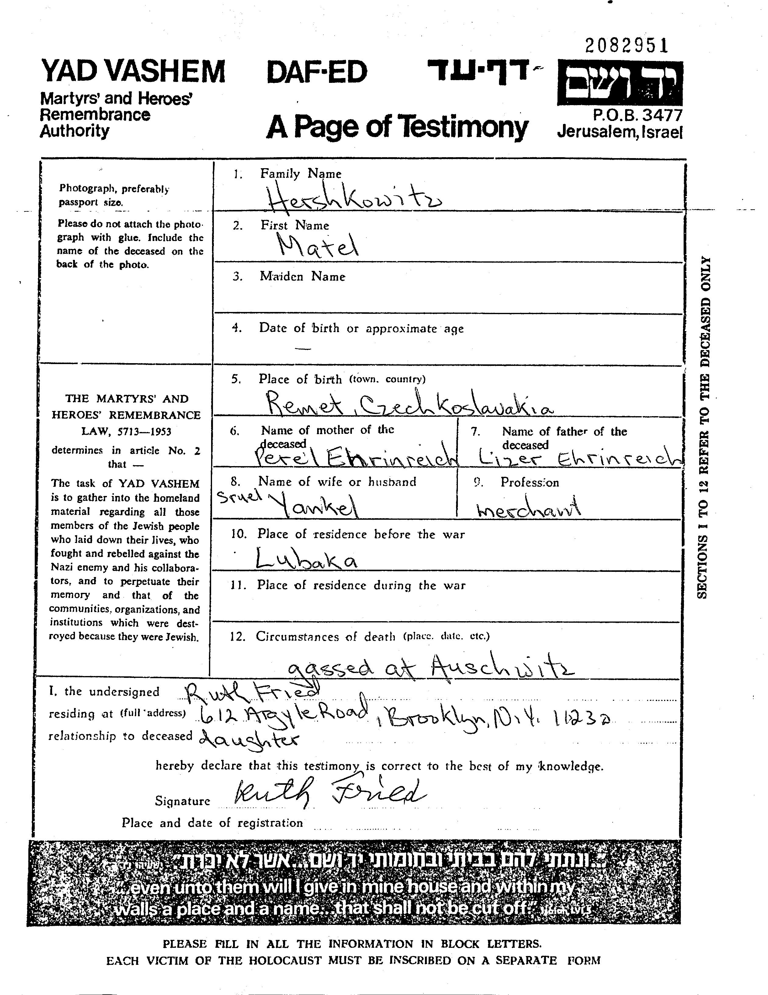 Matel Hershkowitz wurde in Remete, Tschechoslowakei geboren. Sie war die Tochter von Eliezer und Perel, geb. Ehrinreich. Sie war mit Sruel Yankel Verheiratet. Vor dem Zweiten Weltkrieg lebte sie in Luboka, Tschechoslowakei.