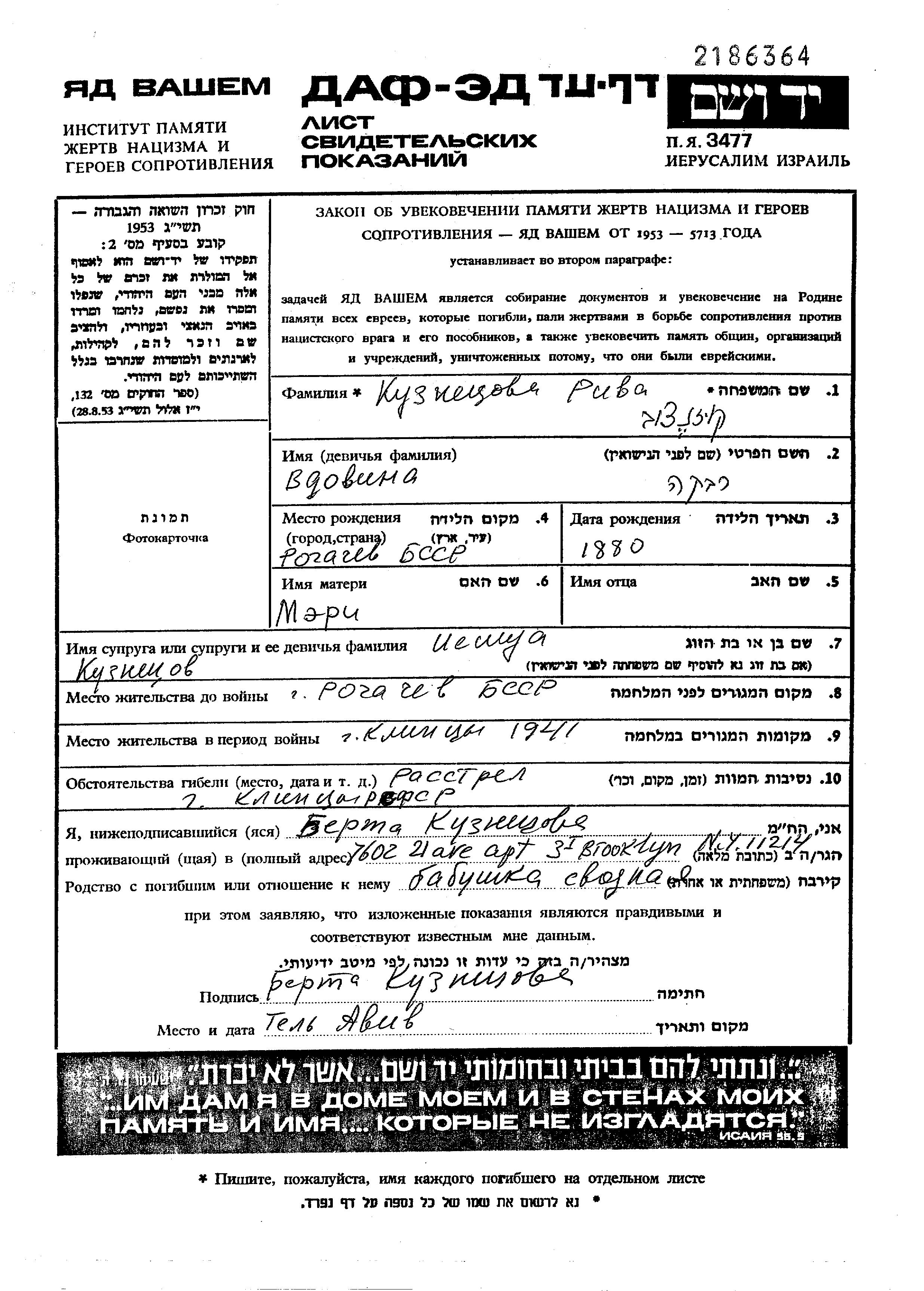 Riva Kuznetzov, geb. Vdovin wurde im Jahr 1880 in Rogachev, Weißrussland (UdSSR) geboren. Sie war die Tochter von Mari. Sie war mit Ioshua Verheiratet. Vor dem Zweiten Weltkrieg lebte sie in Rogachev, Weißrussland (UdSSR). Während des Krieges war sie in Klintsy, Russland (UdSSR).
