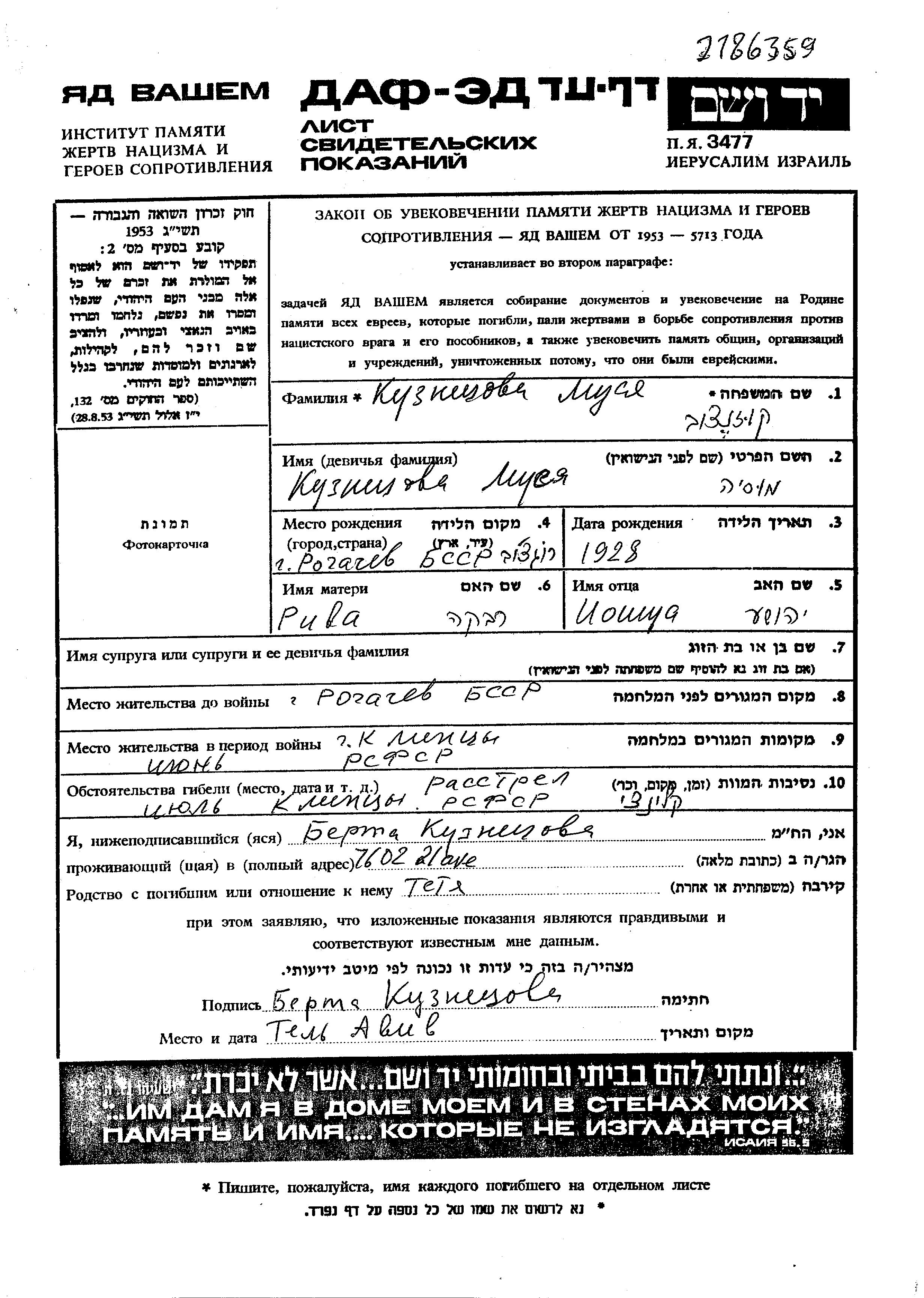 Musya Kuznetzov wurde im Jahr 1928 in Rogachev, Weißrussland (UdSSR) geboren. Sie war die Tochter von Ioshua und Riva, geb. Vdovin. Sie war Kind. Vor dem Zweiten Weltkrieg lebte sie in Rogachev, Weißrussland (UdSSR). Während des Krieges war sie in Klintsy, Russland (UdSSR).