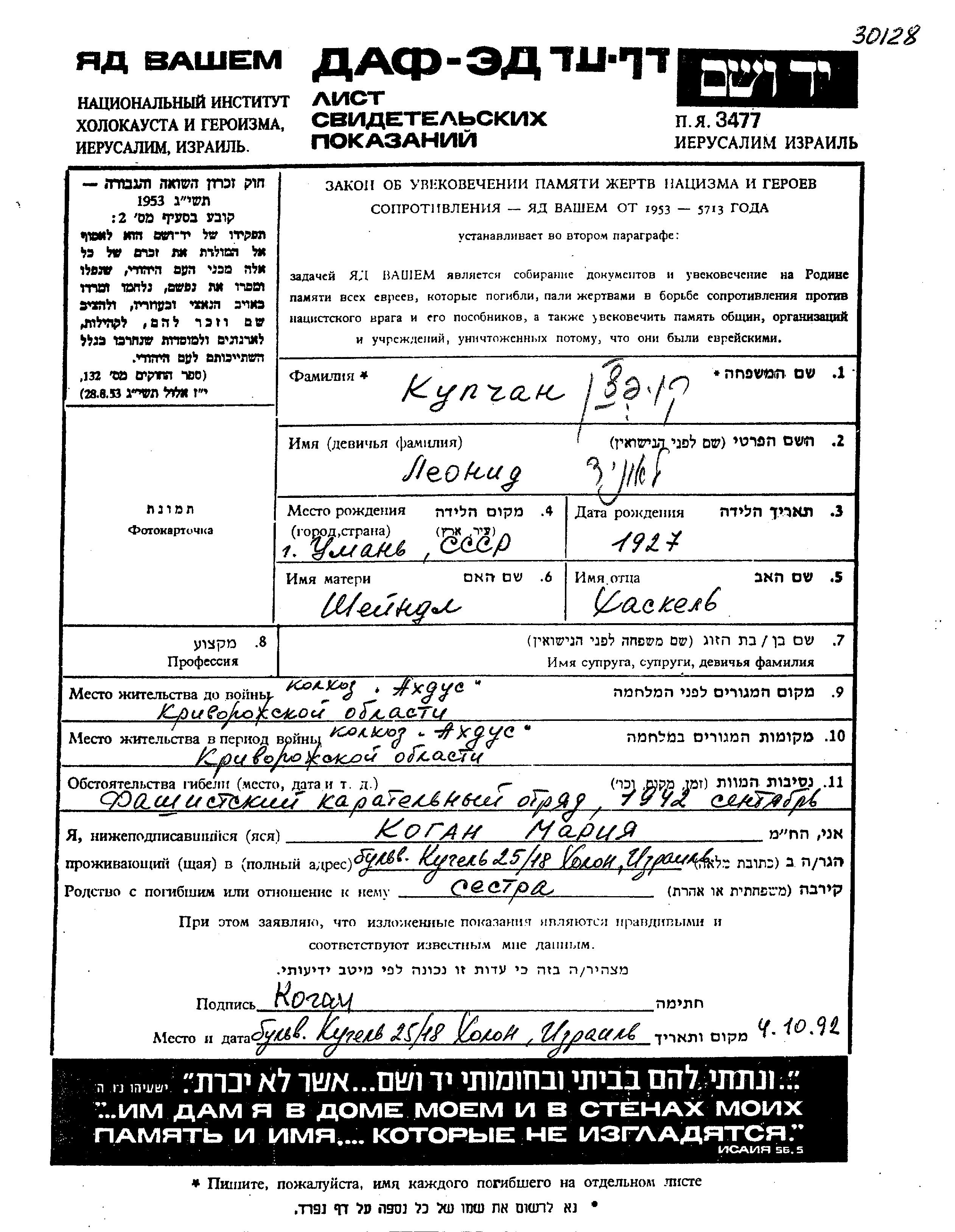 Leonid Kupchan wurde im Jahr 1927 in Uman, Ukraine (UdSSR) geboren. Er war der Sohn von Khaskel und Sheindl, geb. Bushler. Er war Kind. Vor dem Zweiten Weltkrieg lebte er in Akhdus, Ukraine (UdSSR). Während des Krieges war er in Akhdus, Ukraine (UdSSR).