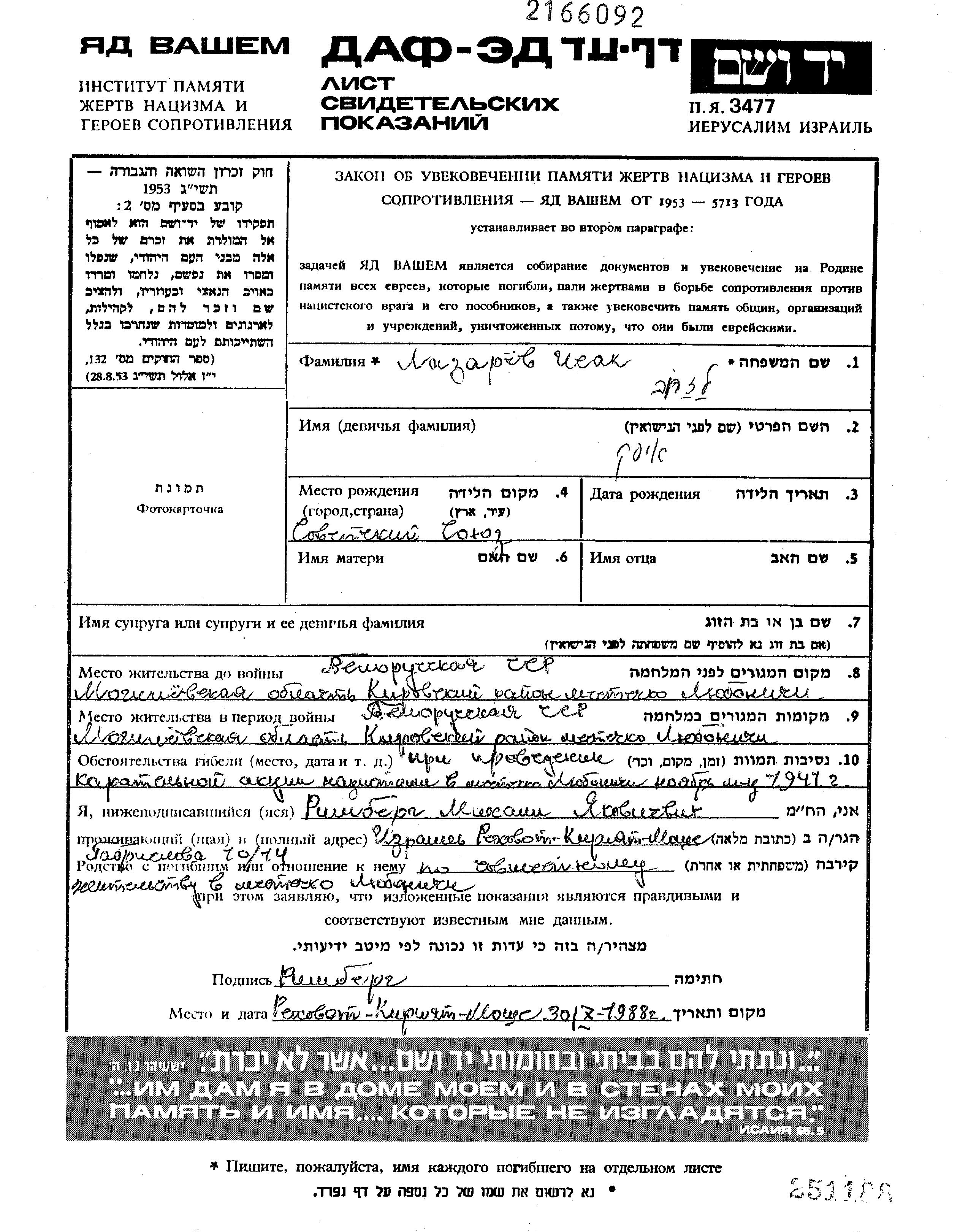 Isak Lazaryov wurde in Sowjetunion geboren. Er war mit Ksenia Verheiratet. Vor dem Zweiten Weltkrieg lebte er in Lyubonichi, Weißrussland (UdSSR). Während des Krieges war er in Lyubonichi, Weißrussland (UdSSR).