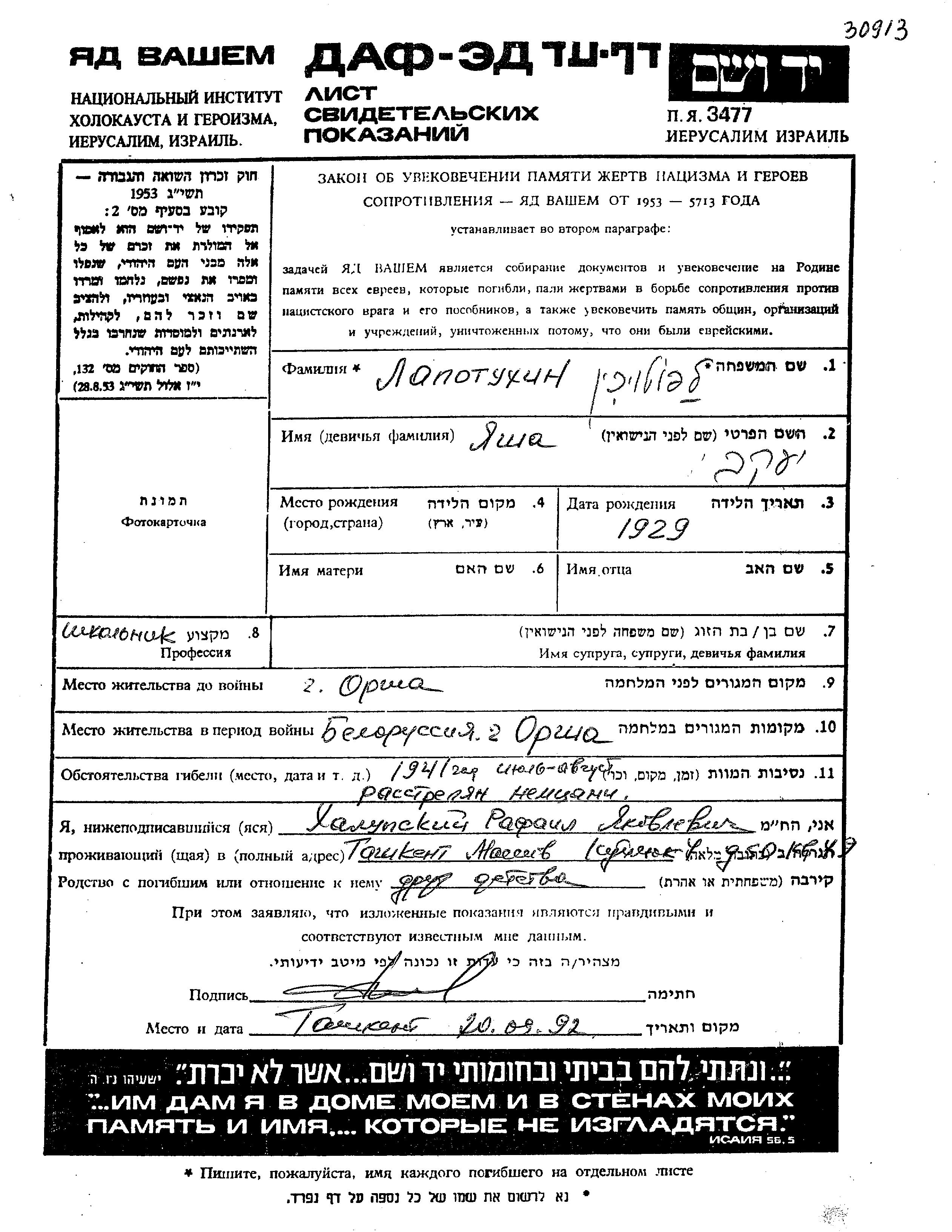 Yasha Lapotukhin wurde im Jahr 1929 geboren. Er war Kind. Vor dem Zweiten Weltkrieg lebte er in Orsha, Weißrussland (UdSSR). Während des Krieges war er in Orsha, Weißrussland (UdSSR).