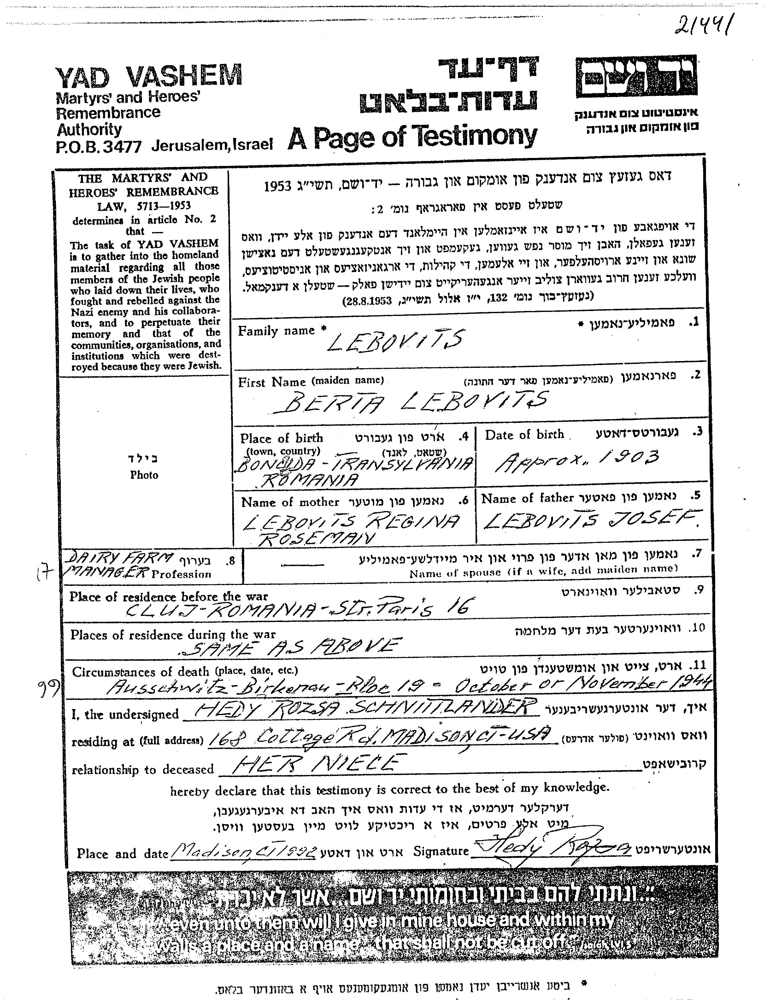 Lebovits Berta 1903 Cluj, Rumänien Gedenkblatt