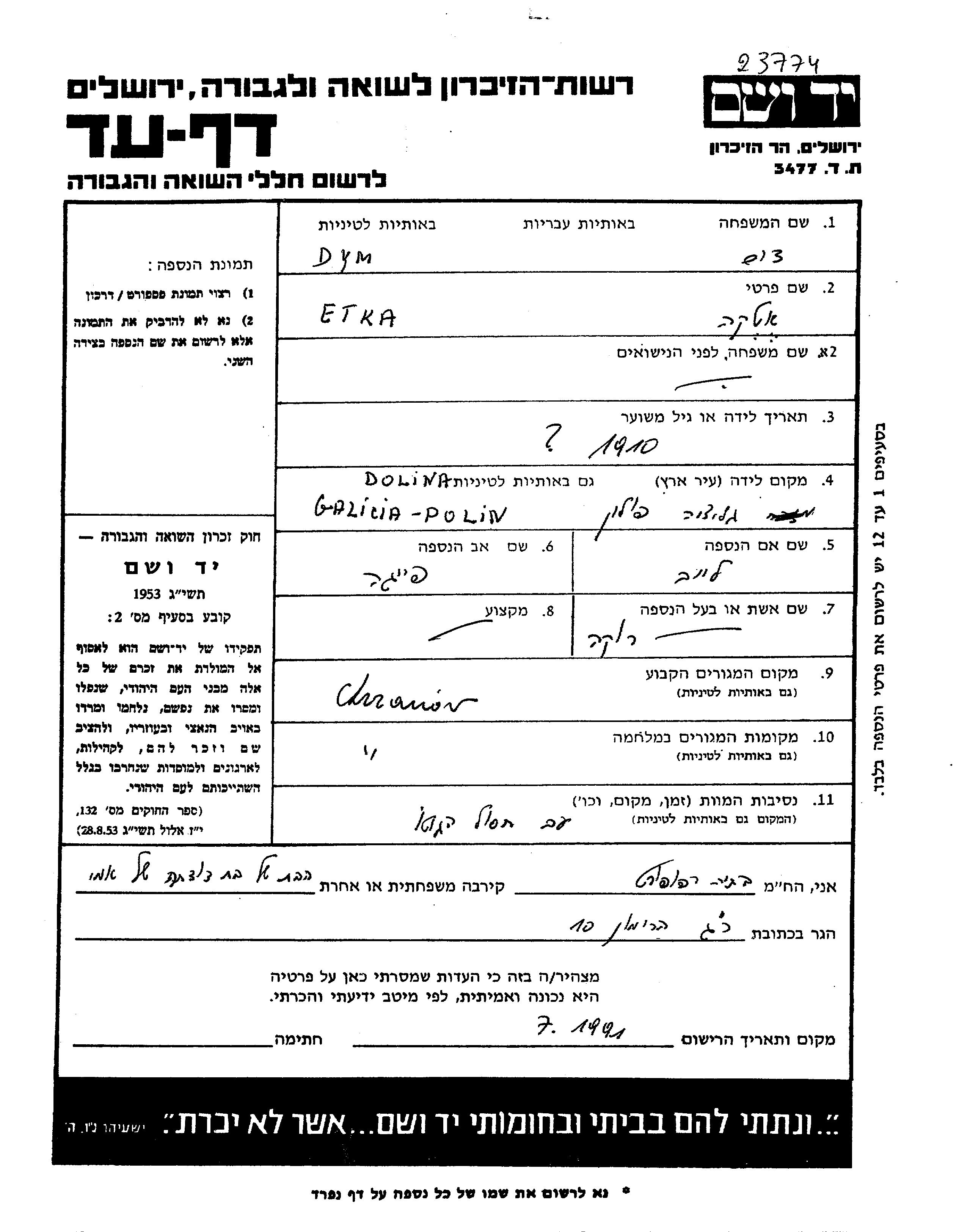 Etka Dym wurde im Jahr 1910 in Dolina, Polen geboren. Sie war die Tochter von Leib und Feiga, geb. Hertz. Vor dem Zweiten Weltkrieg lebte sie in Chrzanow, Polen. Während des Krieges war sie in Chrzanow, Polen.
