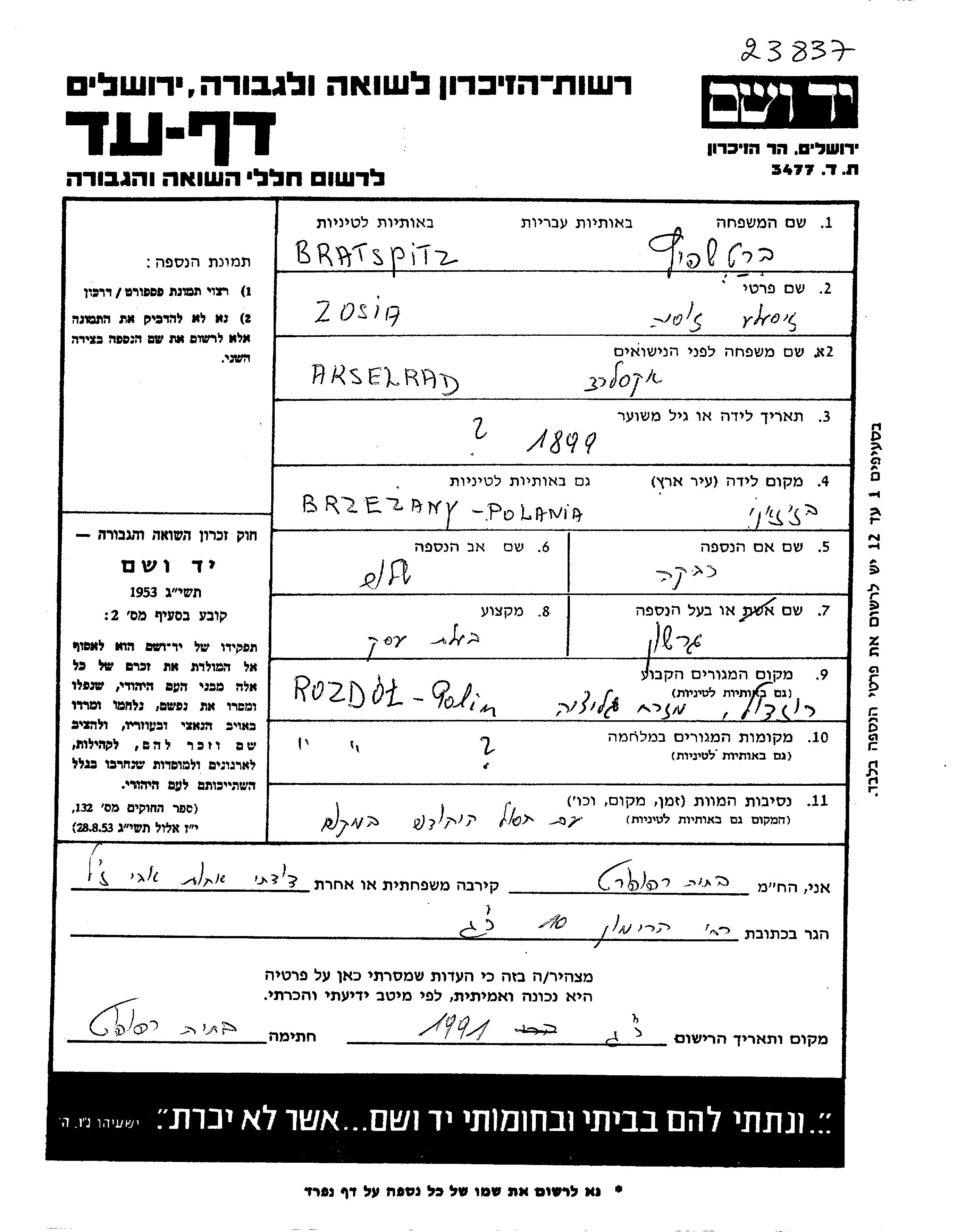 Zosia Bratspitz wurde im Jahr 1899 in Brzezany, Polen geboren. Er war der Sohn von Shalom und Rivka, geb. Shwam. Er war Kaufmann/-frau und mit Gershon, geb. Akselrad Verheiratet. Vor dem Zweiten Weltkrieg lebte er in Rozdol, Polen. Während des Krieges war er in Rozdol, Polen.