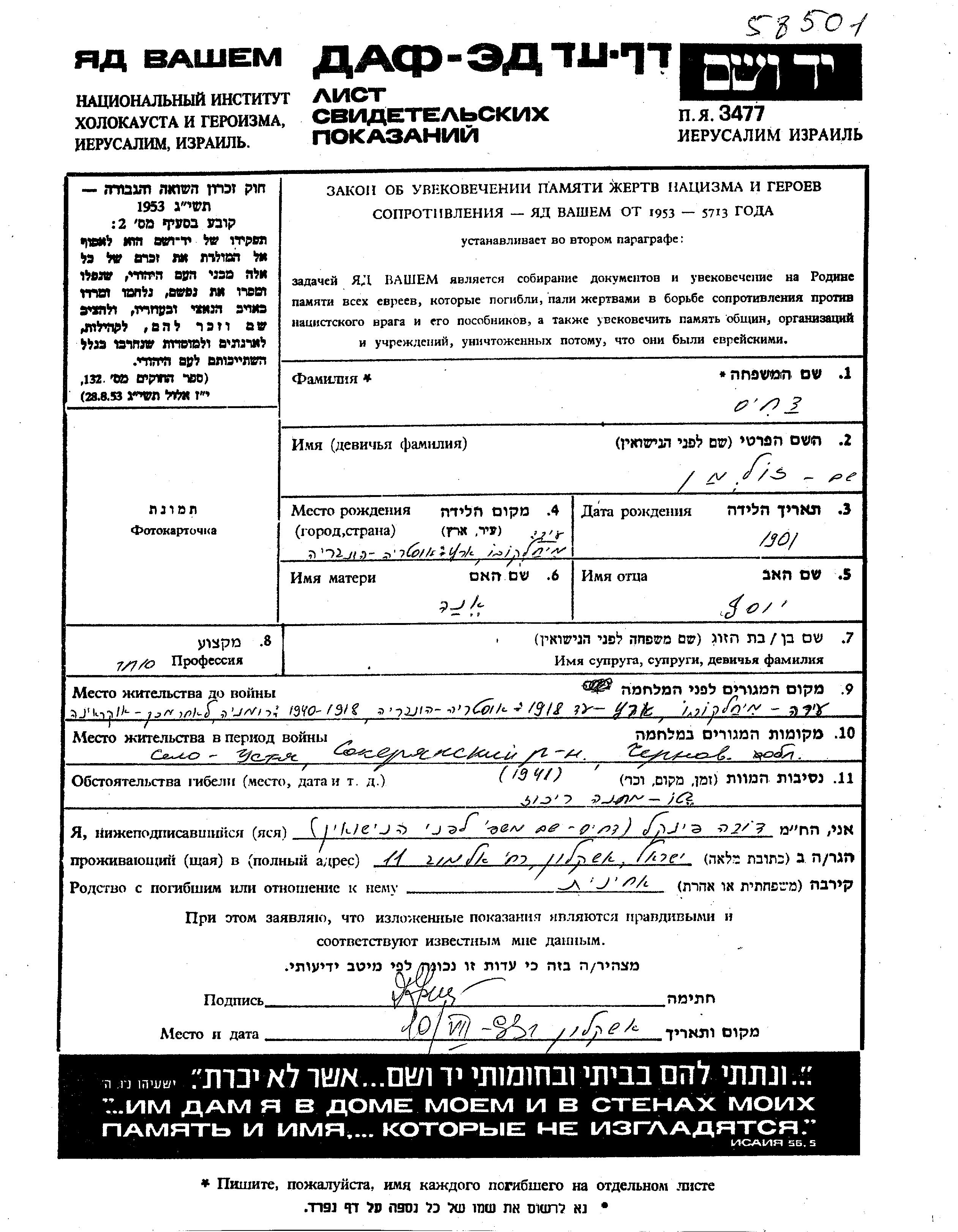Zolman Deikhes wurde im Jahr 1901 in Mikhalkovo, Rumänien geboren. Er war der Sohn von Yosef und Anna. Er war Kaufmann/-frau. Vor dem Zweiten Weltkrieg lebte er in Mikhalkovo, Rumänien. Während des Krieges war er in Ustia, Rumänien.