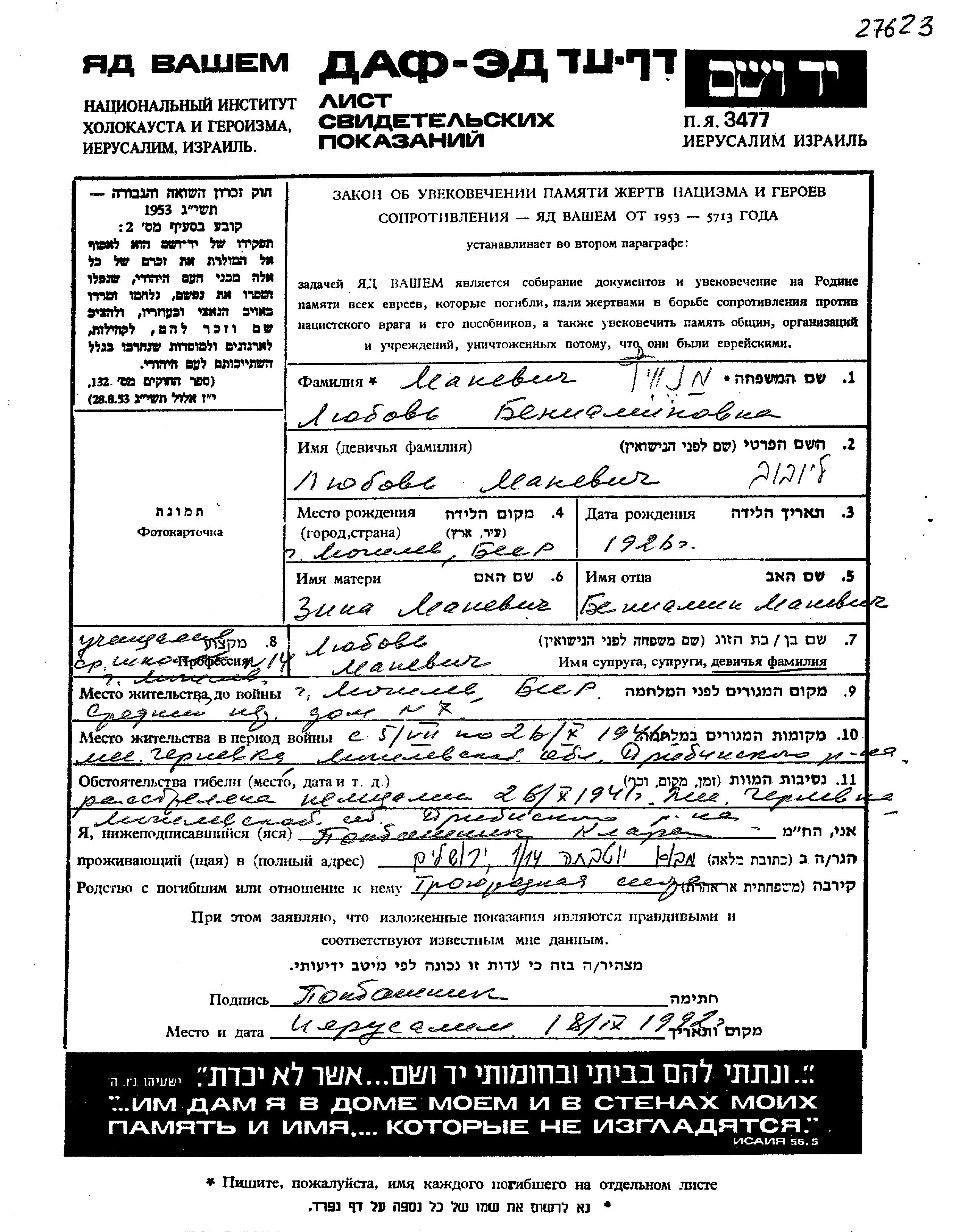 Lyubov Manevich wurde im Jahr 1926 in Mogilev, Weißrussland (UdSSR) geboren. Sie war die Tochter von Beniamin und Zina, geb. Zelikov. Sie war Schüler/-in und Kind. Vor dem Zweiten Weltkrieg lebte sie in Mogilev, Weißrussland (UdSSR). Während des Krieges war sie in Chernevka, Weißrussland (UdSSR).