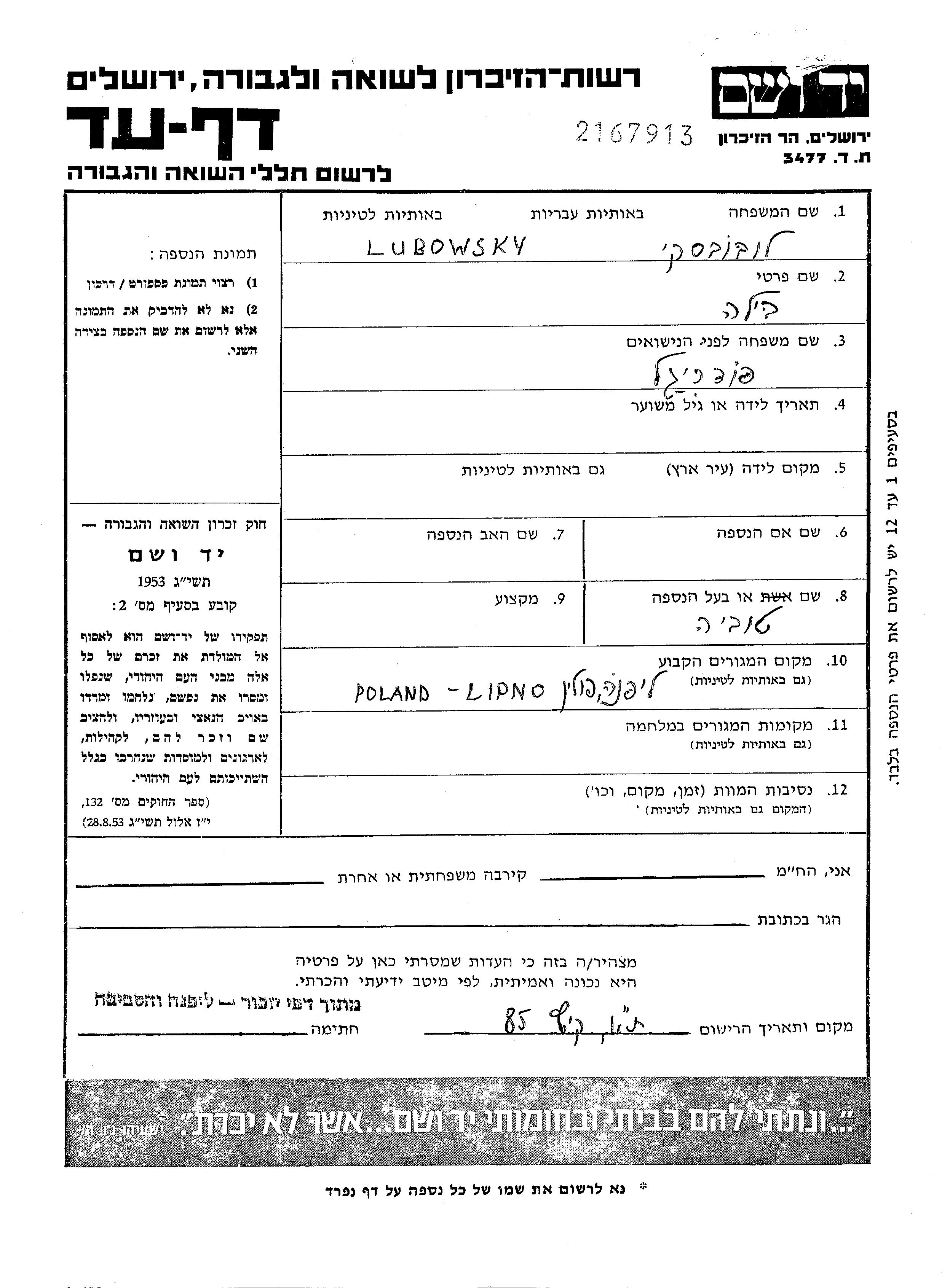 Lubowsky Beila Lipno, Polen Gedenkblatt