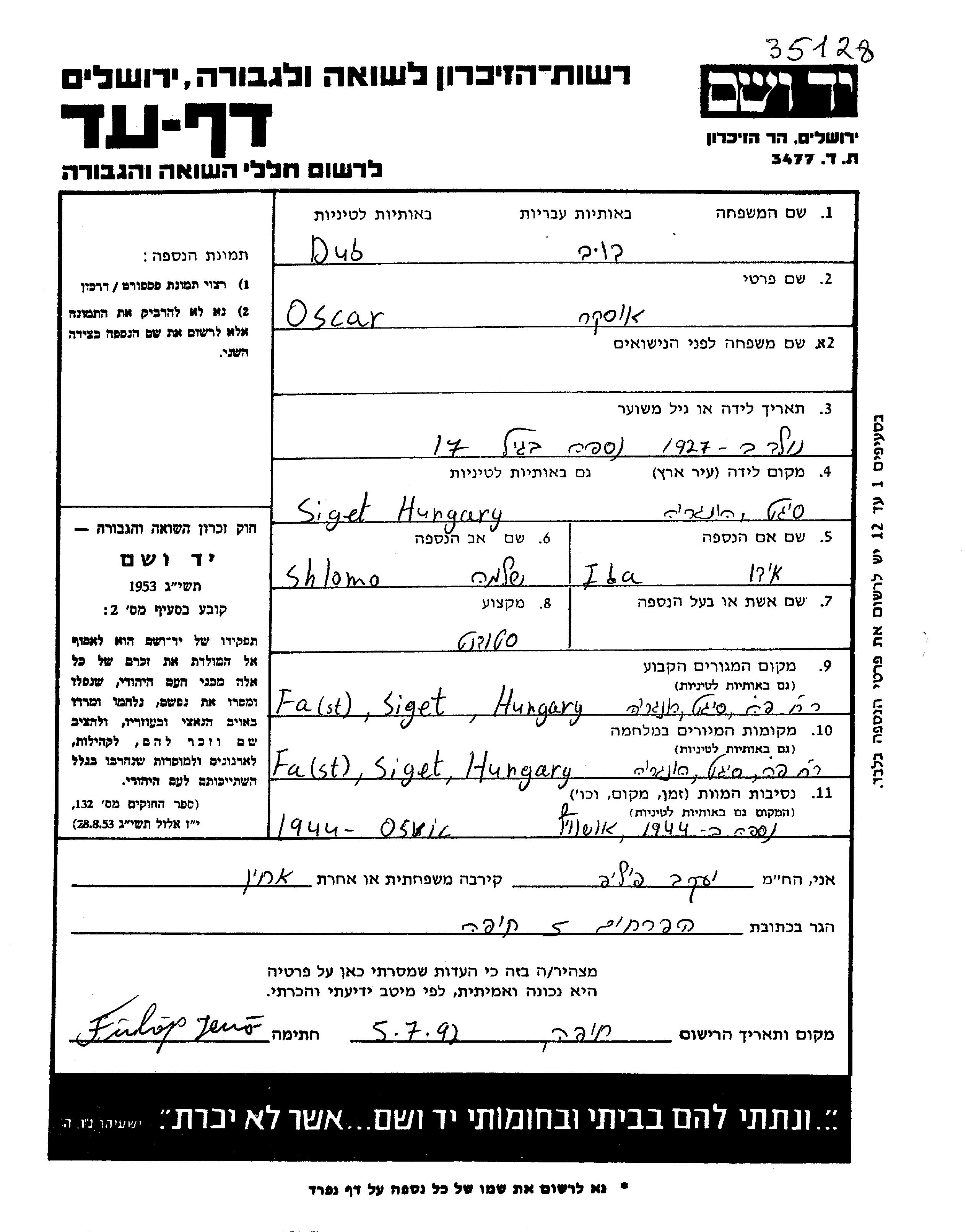 Oscar Dub Dov wurde im Jahr 1927 in Sighet, Rumänien geboren. Er war der Sohn von Shlomo und Ida, geb. Fulop Filip. Er war Student und Kind. Vor dem Zweiten Weltkrieg lebte er in Sighet, Rumänien. Während des Krieges war er in Sighet, Rumänien.