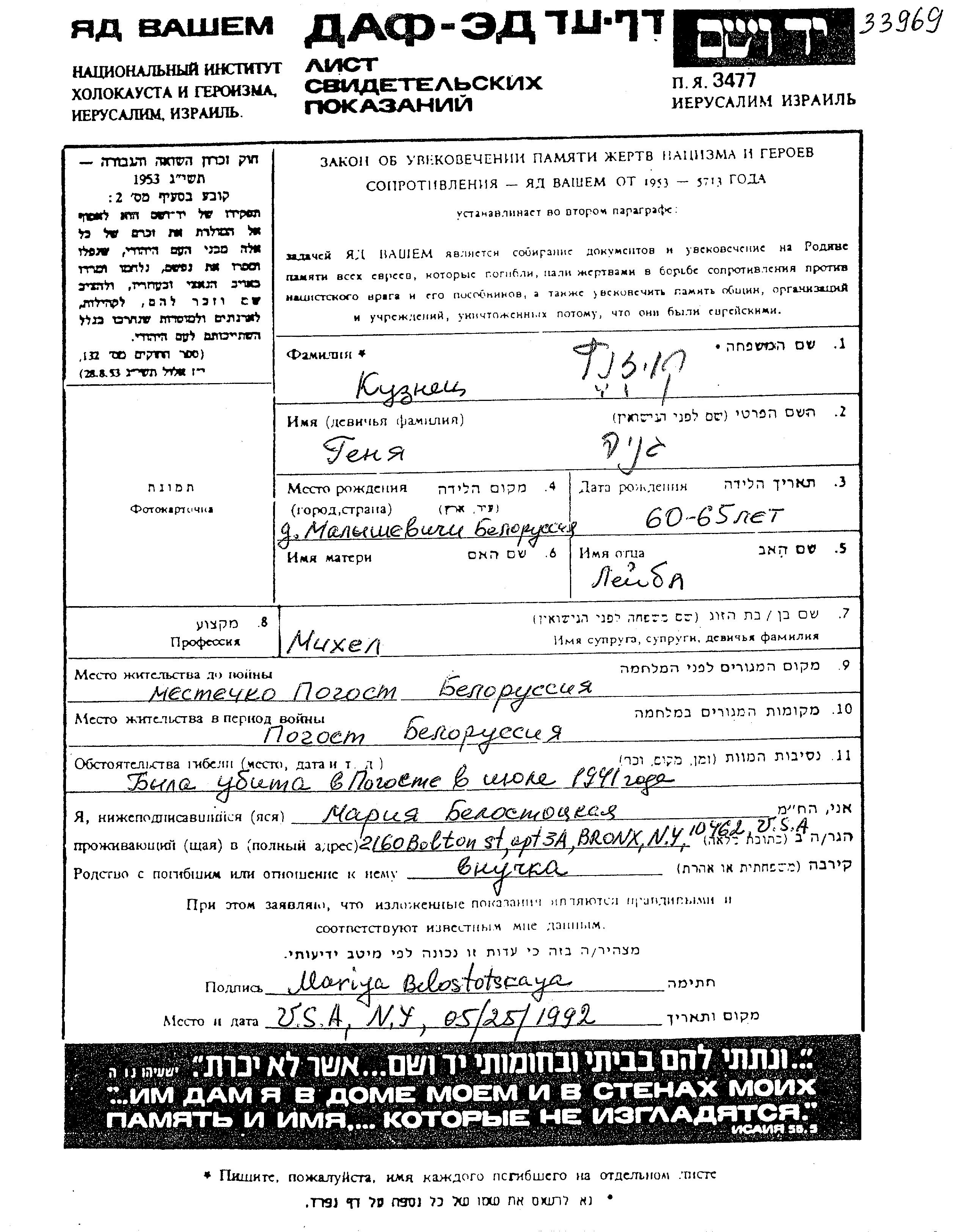 Genia Kuznetz wurde in Malyshevichi, Weißrussland (UdSSR) geboren. Sie war die Tochter von Leibl. Sie war mit Mikhel Verheiratet. Vor dem Zweiten Weltkrieg lebte sie in Pogost, Weißrussland (UdSSR). Während des Krieges war sie in Pogost, Weißrussland (UdSSR).