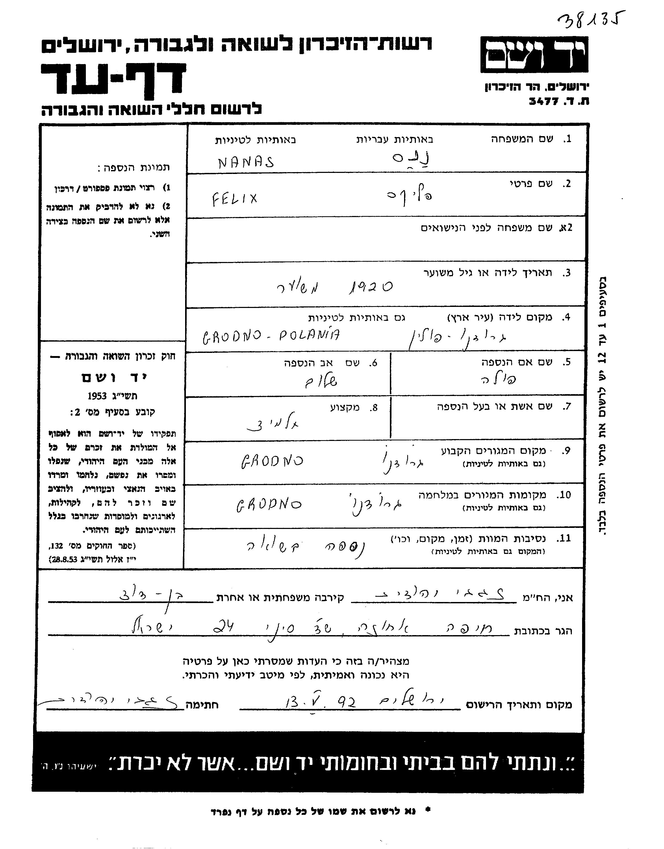 Felix Nanas wurde im Jahr 1920 in Grodno, Polen geboren. Er war der Sohn von Szalom und Pola. Er war Schüler/-in. Vor dem Zweiten Weltkrieg lebte er in Grodno, Polen. Während des Krieges war er in Grodno, Polen.