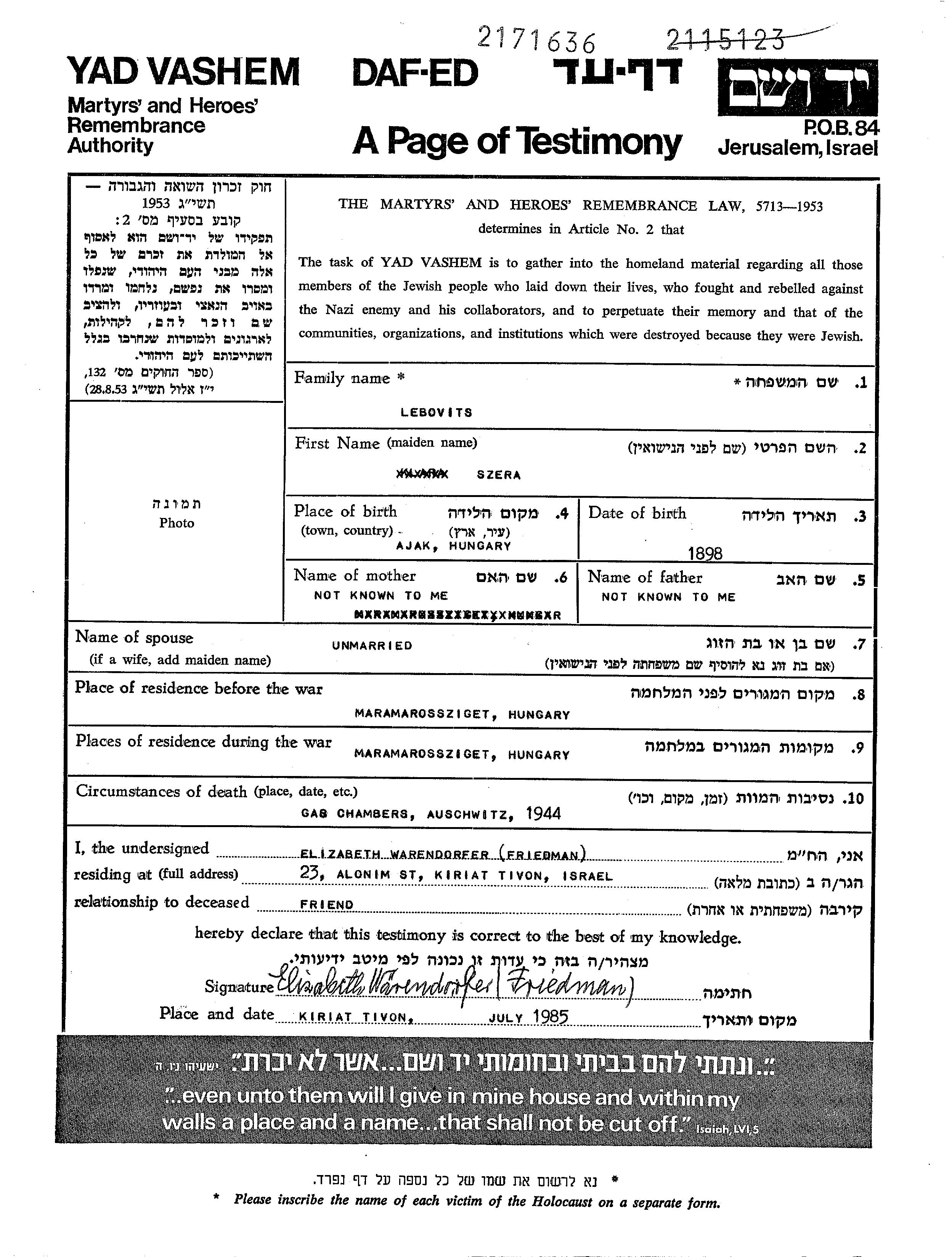 Szera Lebovits wurde im Jahr 1898 in Ajak, Ungarn geboren. Sie war Ledig. Vor dem Zweiten Weltkrieg lebte sie in Maramarossziget, Rumänien. Während des Krieges war sie in Maramarossziget, Rumänien.