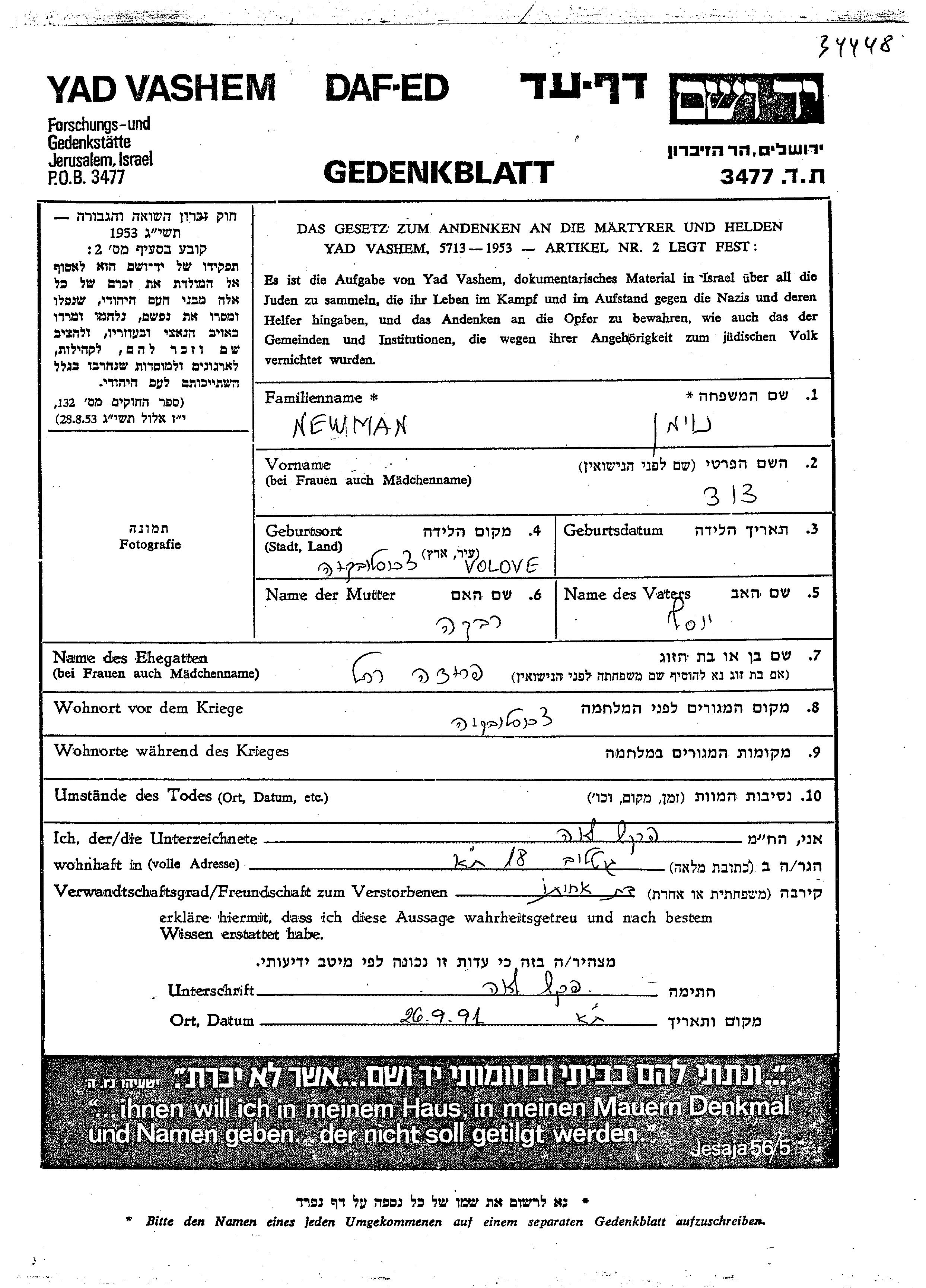David Neuman wurde in Volove, Tschechoslowakei geboren. Er war der Sohn von Josef und Rivka. Er war mit Frieda Rachel Verheiratet. Vor dem Zweiten Weltkrieg lebte er in Tschechoslowakei. Während des Krieges war er in Tschechoslowakei.
