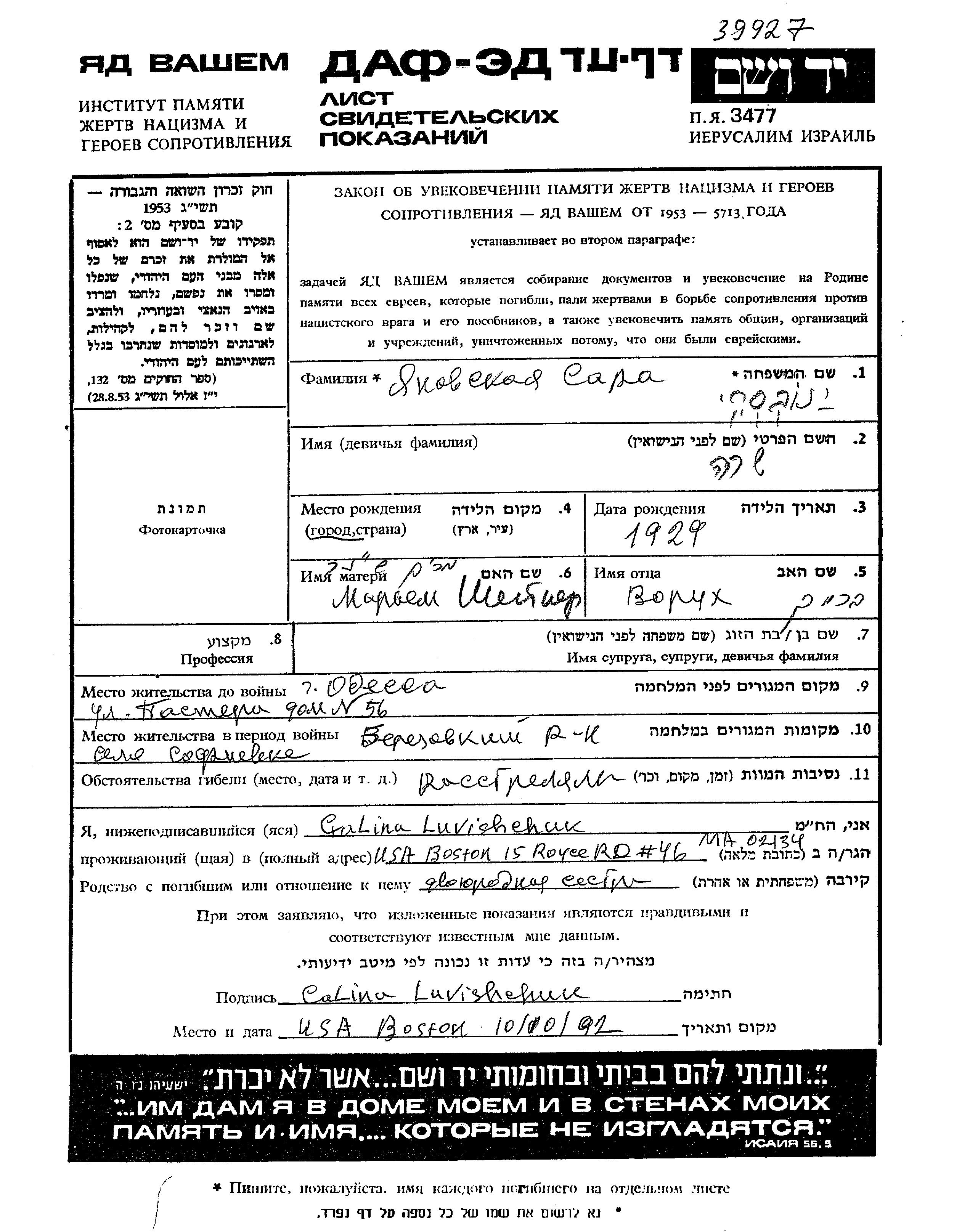 Yanovski Sara 1929 Odessa, Ukraine (UdSSR) Gedenkblatt