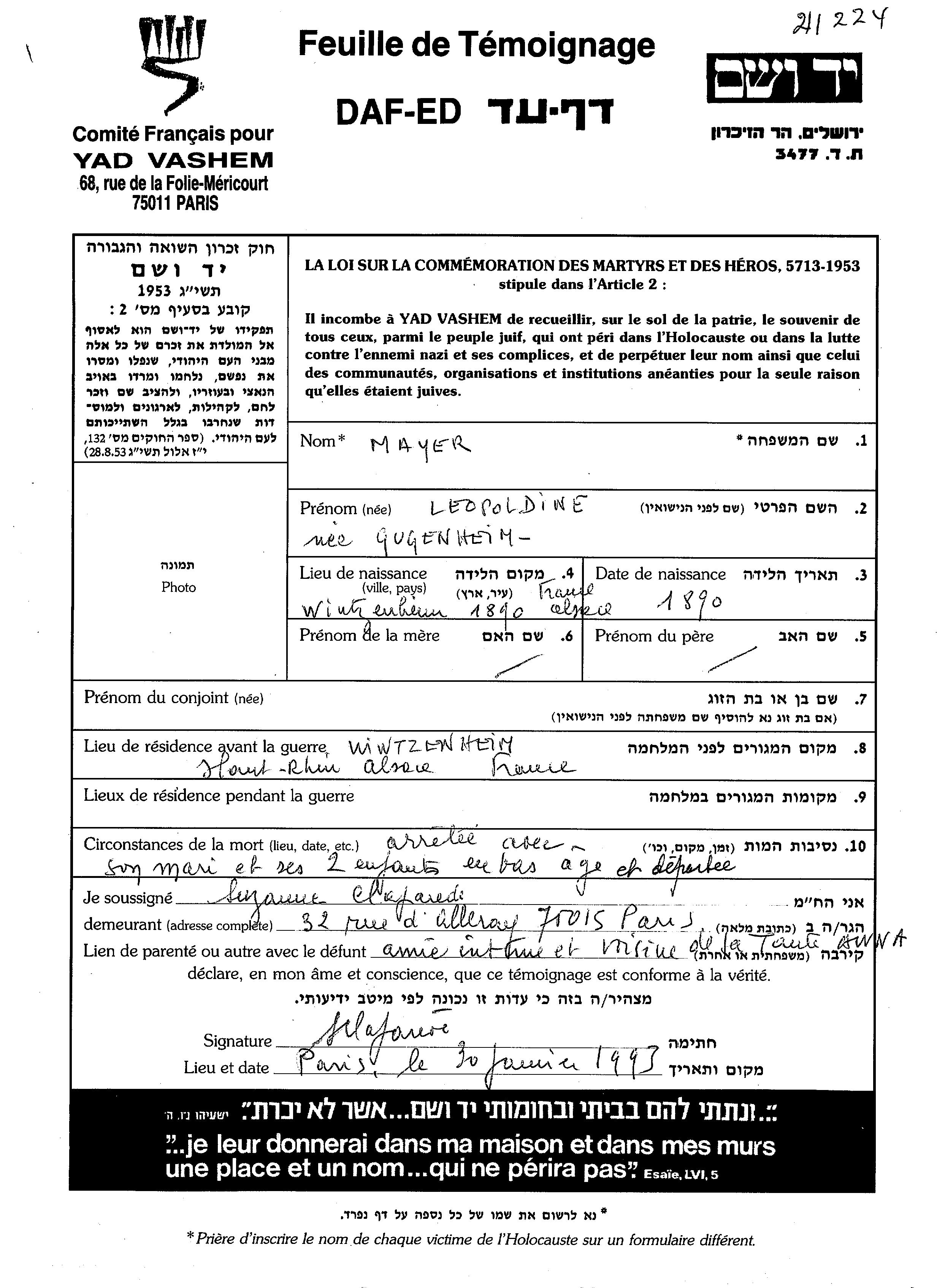 Leopoldin Mayer, geb. Gugenheim wurde im Jahr 1890 in Wintzenheim, Frankreich geboren. Sie war Verheiratet. Vor dem Zweiten Weltkrieg lebte sie in Wintzenheim, Frankreich.