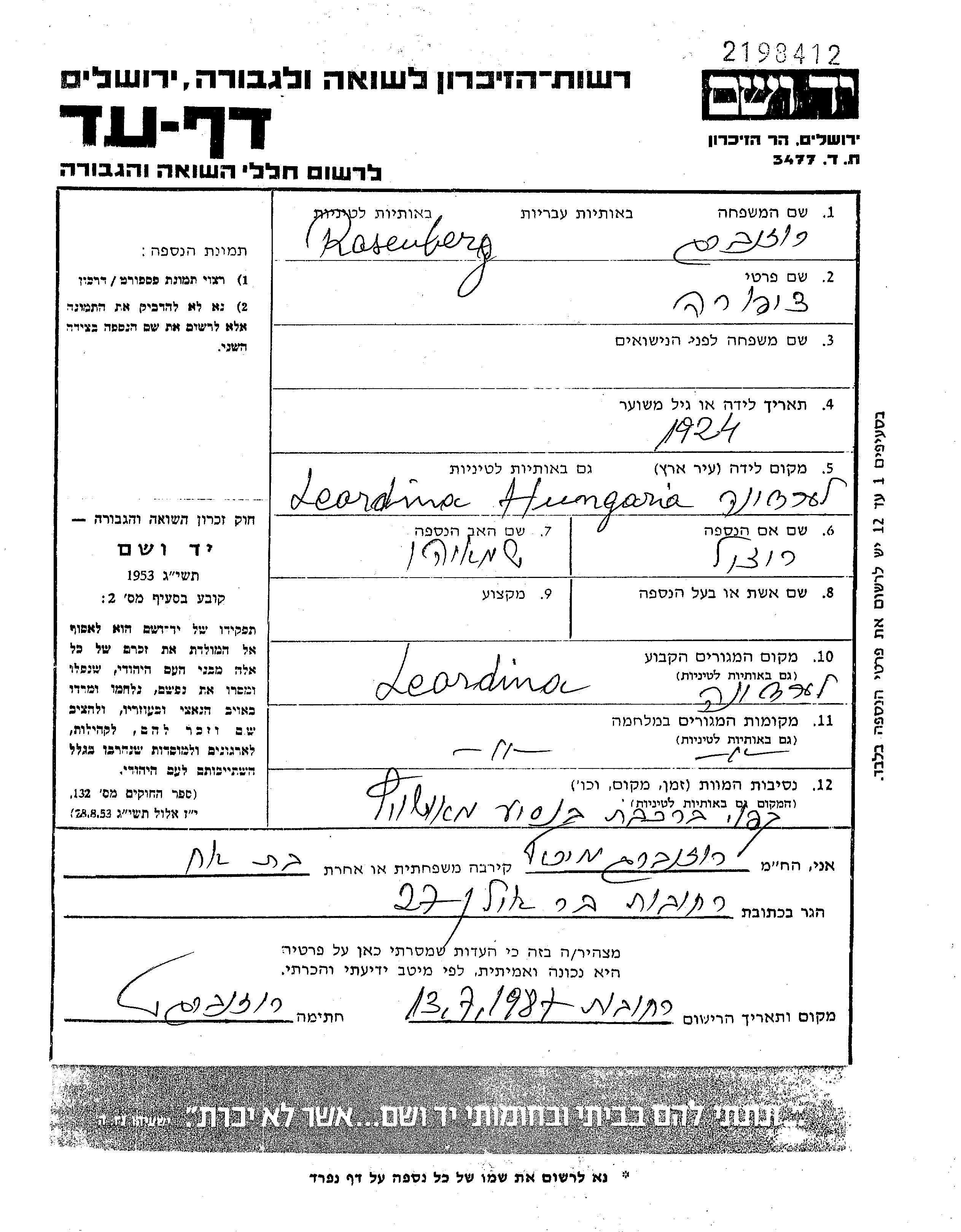 Rosenberg Tzipora 1924 Leordina, Rumänien Gedenkblatt