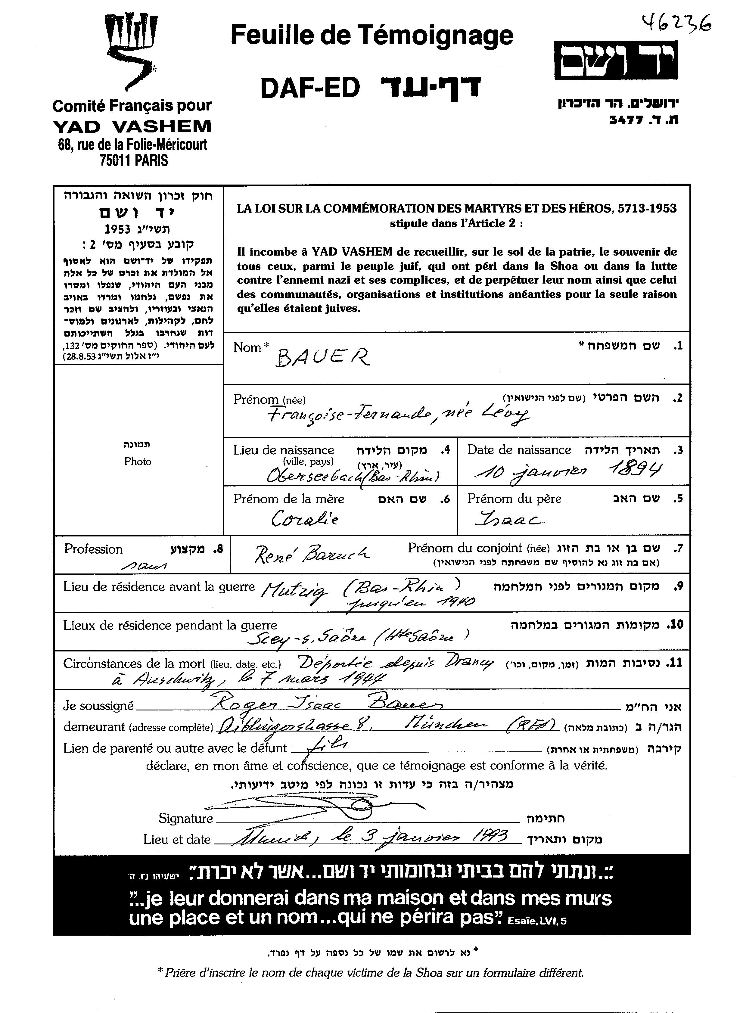 Francoise Fernande Bauer, geb. Levy wurde im Jahr 1894 in Oberseebach, Frankreich geboren. Sie war die Tochter von Isaac und Coralie. Sie war mit Baruch Rene Verheiratet. Vor dem Zweiten Weltkrieg lebte sie in Mutzig, Frankreich. Während des Krieges war sie in Scey sur Saone, Frankreich.