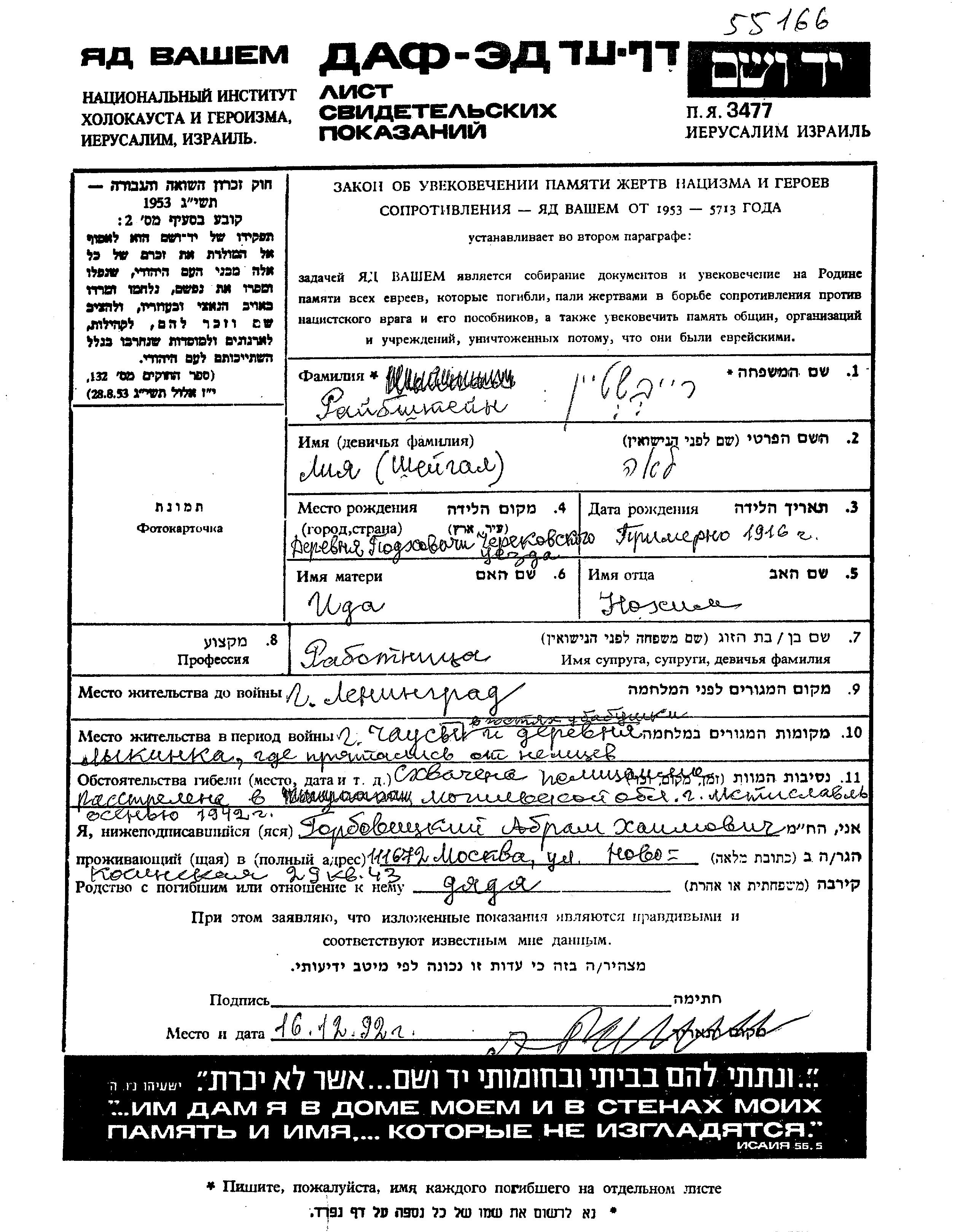 Lia Raibshtein, geb. Sheigal wurde im Jahr 1916 in Podkhovichi, Weißrussland (UdSSR) geboren. Sie war die Tochter von Nokhim und Ida, geb. Gorbovitzki. Sie war Arbeiter/-in. Vor dem Zweiten Weltkrieg lebte sie in Leningrad, Russland (UdSSR). Während des Krieges war sie in Lykinka, Weißrussland (UdSSR).