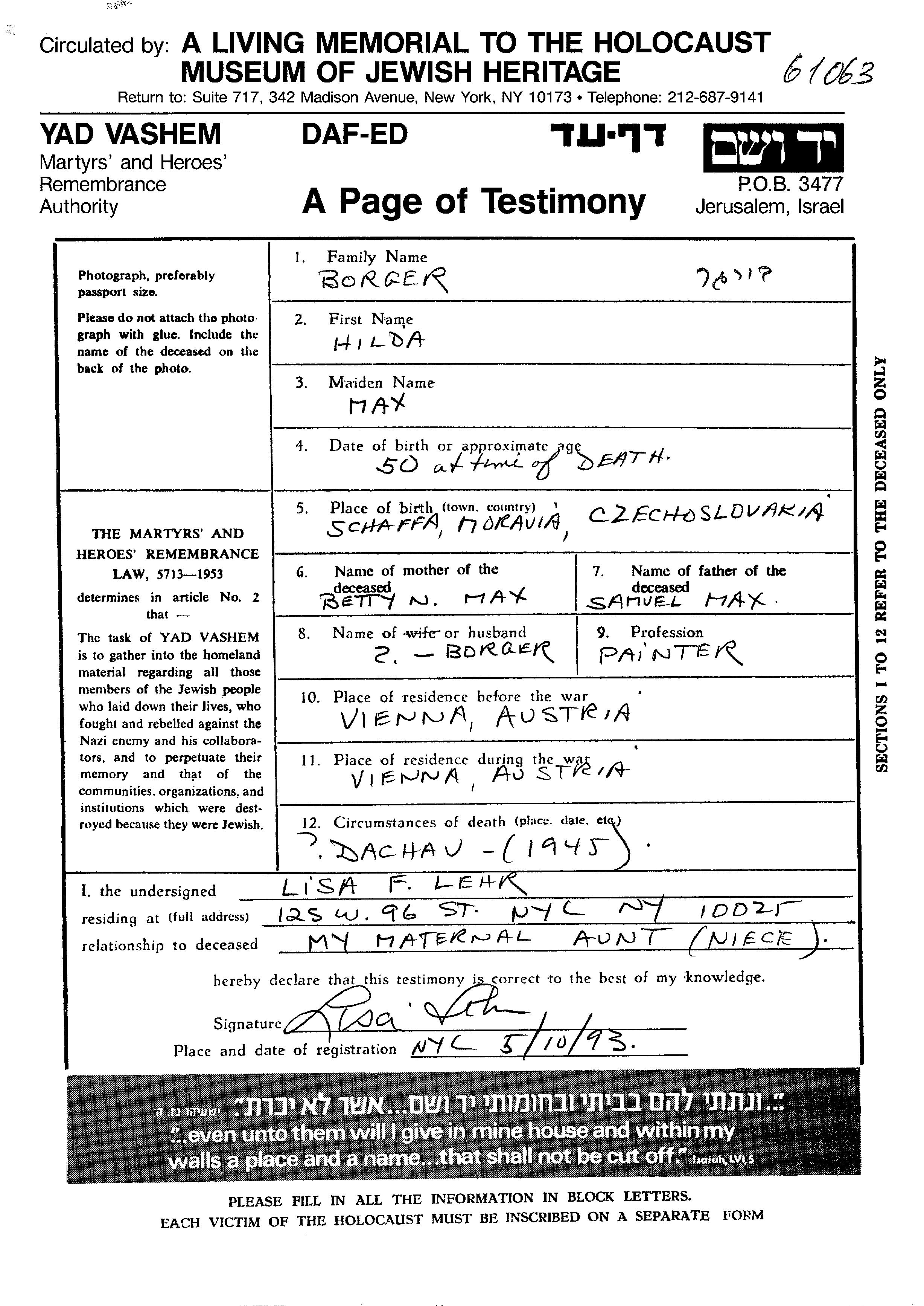 Hilda Burger, geb. Max wurde in Schaffa, Tschechoslowakei geboren. Sie war die Tochter von Samuel und Betty, geb. Neumann. Sie war Kunsthandwerker und Verheiratet. Vor dem Zweiten Weltkrieg lebte sie in Wien, Österreich. Während des Krieges war sie in Wien, Österreich.