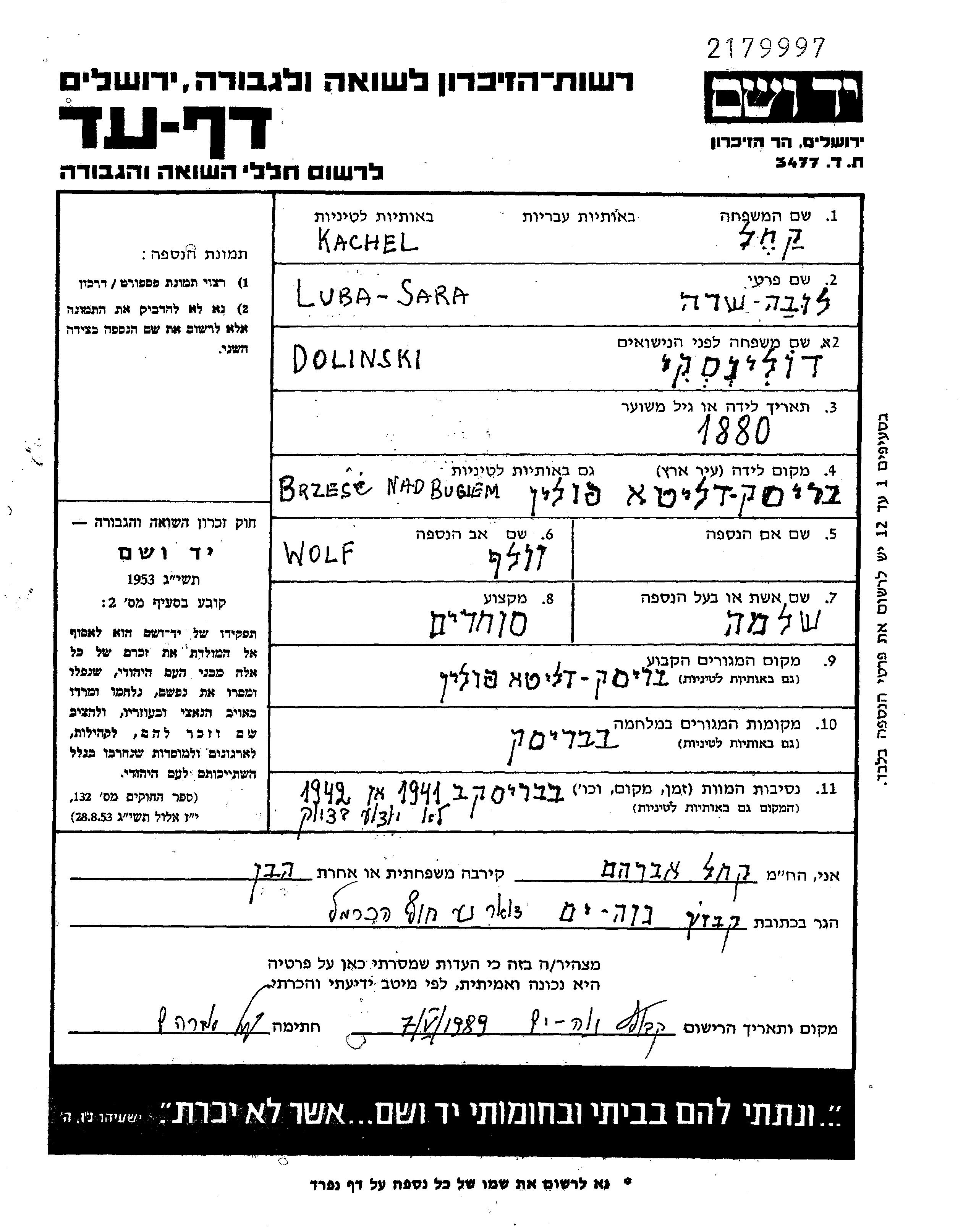 Luba Sara Kachel Kahal, geb. Dolinski wurde im Jahr 1880 in Brześć nad Bugiem, Polen geboren. Sie war die Tochter von Wolf. Sie war mit Szlomo Verheiratet. Vor dem Zweiten Weltkrieg lebte sie in Brześć nad Bugiem, Polen. Während des Krieges war sie in Brest Litowsk, Polen.