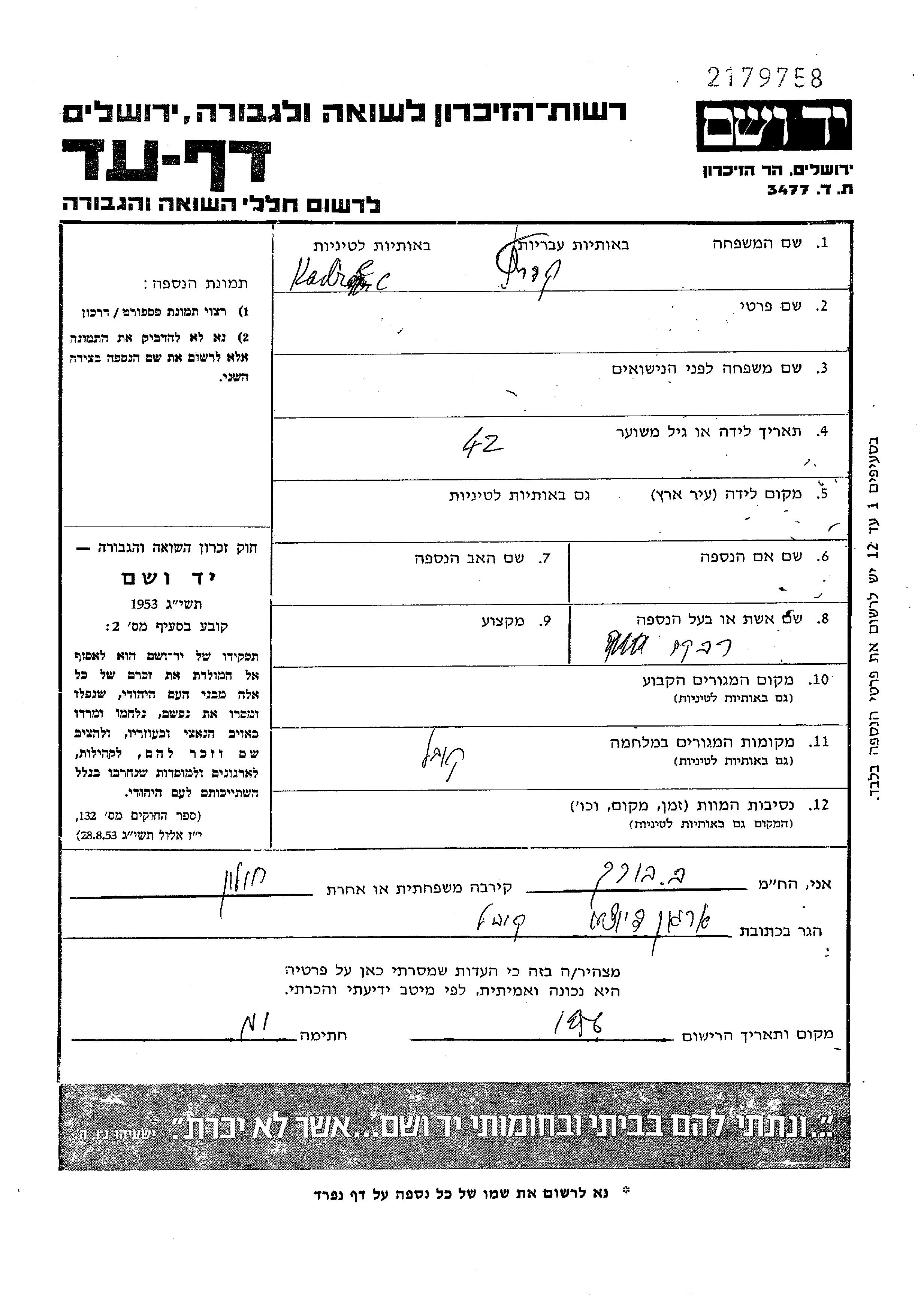Rivka Kadiec. Sie war Verheiratet. Vor dem Zweiten Weltkrieg lebte sie in Kowel, Polen. Während des Krieges war sie in Kowel, Polen.