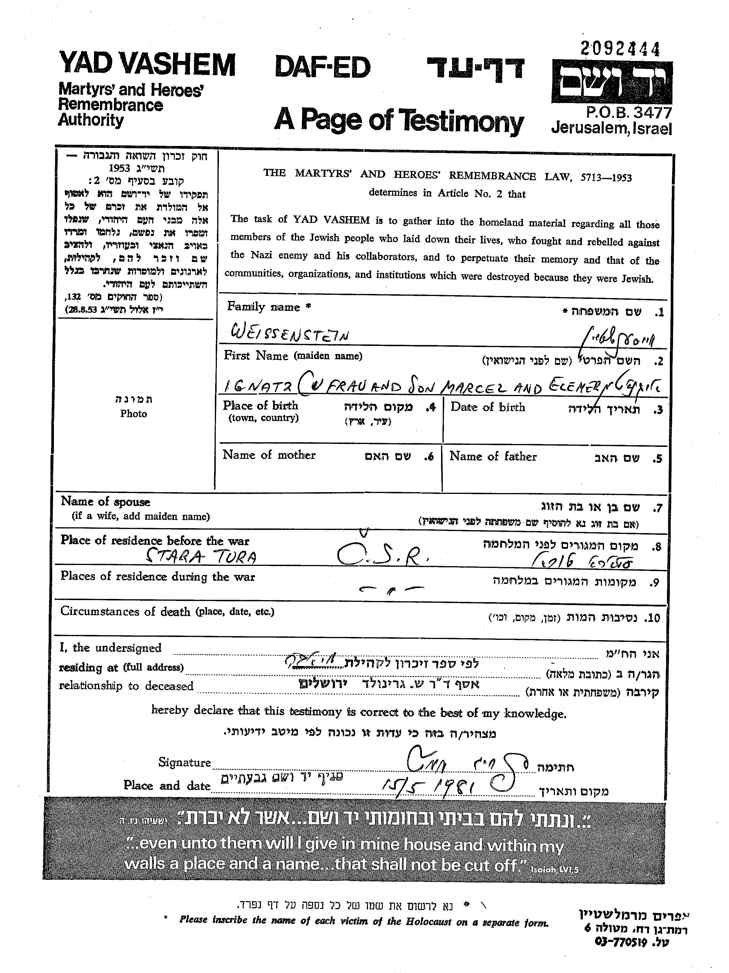 Ignatz Weissenstein. Er war Verheiratet. Vor dem Zweiten Weltkrieg lebte er in Stara Tura, Tschechoslowakei. Während des Krieges war er in Stara Tura, Tschechoslowakei.