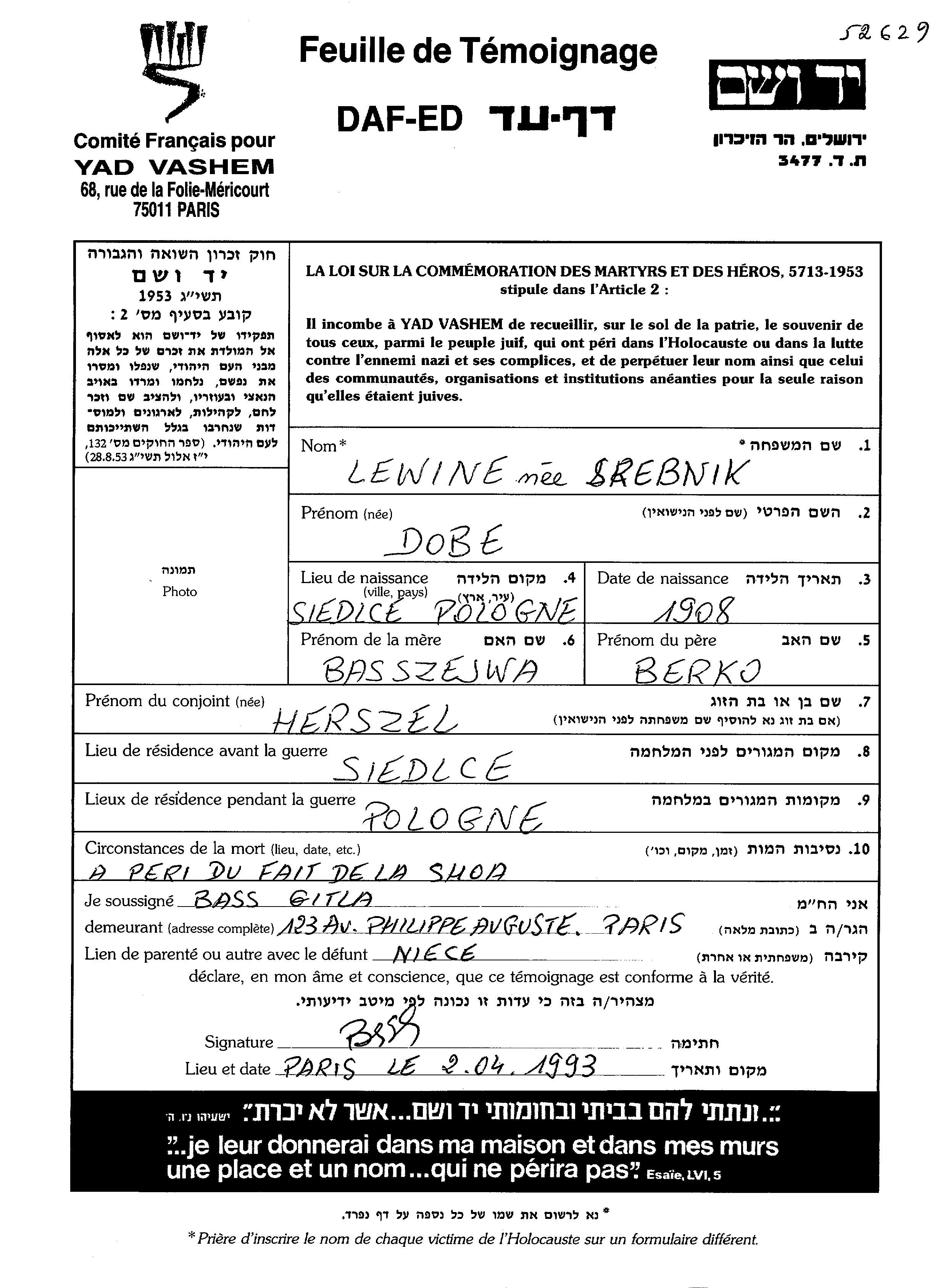Dobe Lewine, geb. Srebnik wurde im Jahr 1908 in Siedlce, Polen geboren. Sie war die Tochter von Berko und Bas Szejwa, geb. Mandelbaum. Sie war mit Herszel Verheiratet. Vor dem Zweiten Weltkrieg lebte sie in Siedlce, Polen.