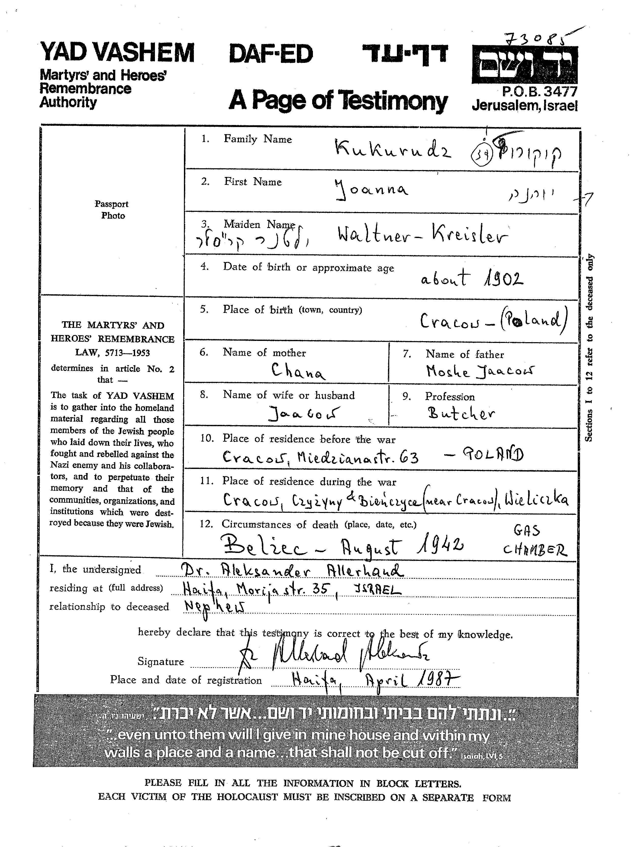 Joanna Kukurudz, geb. Waltner wurde im Jahr 1902 in Krakow, Polen geboren. Sie war die Tochter von Moshe Jaacow und Chana. Sie war mit Jaacow Verheiratet. Vor dem Zweiten Weltkrieg lebte sie in Krakow, Polen. Während des Krieges war sie in Wieliczka, Polen.