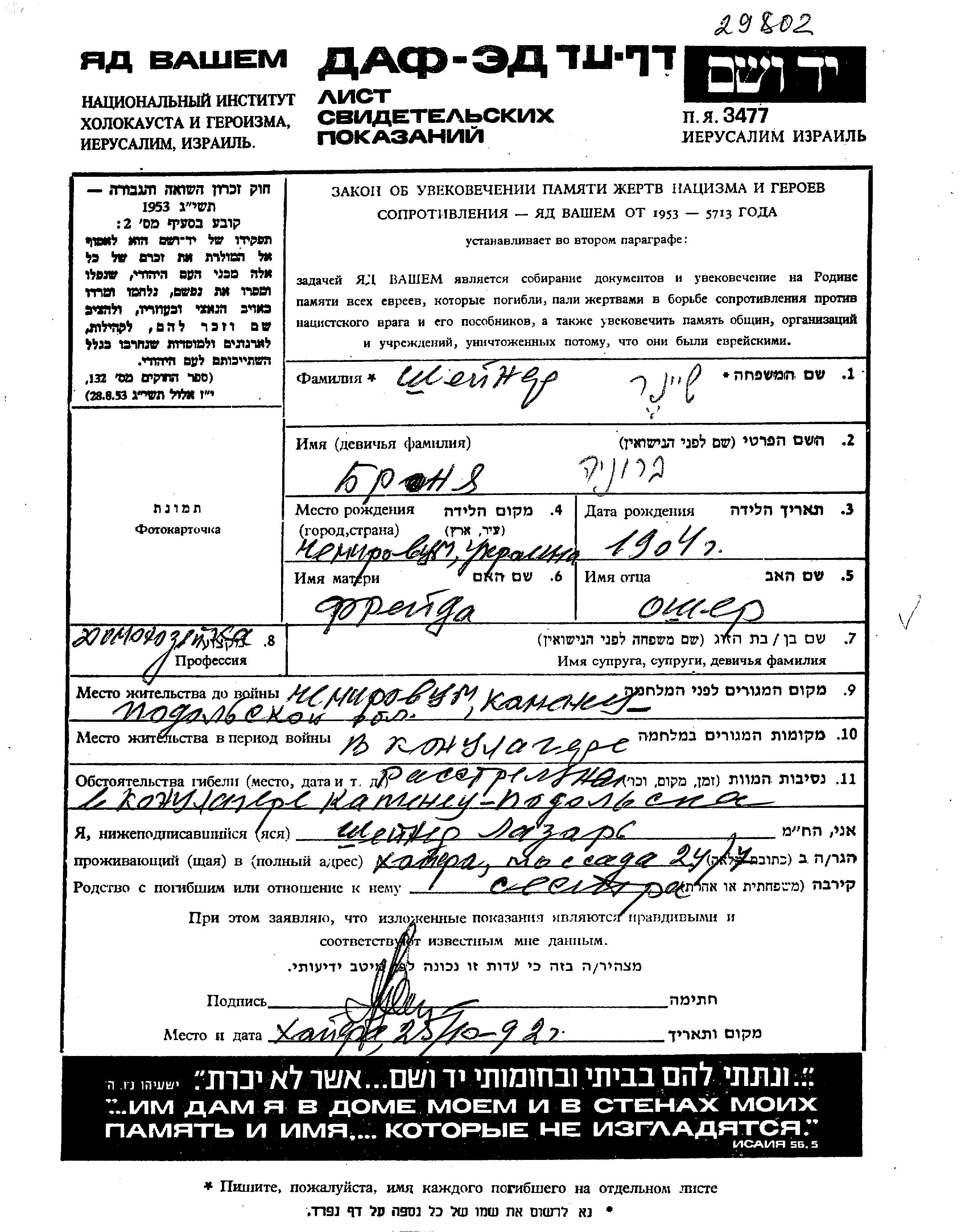 Bronia Sheiner wurde im Jahr 1904 in Chemerovtsy, Ukraine (UdSSR) geboren. Sie war die Tochter von Osher und Freida. Sie war Hausfrau. Vor dem Zweiten Weltkrieg lebte sie in Chemerovtsy, Ukraine (UdSSR). Während des Krieges war sie in Kamenets Podolskiy, Ukraine (UdSSR).