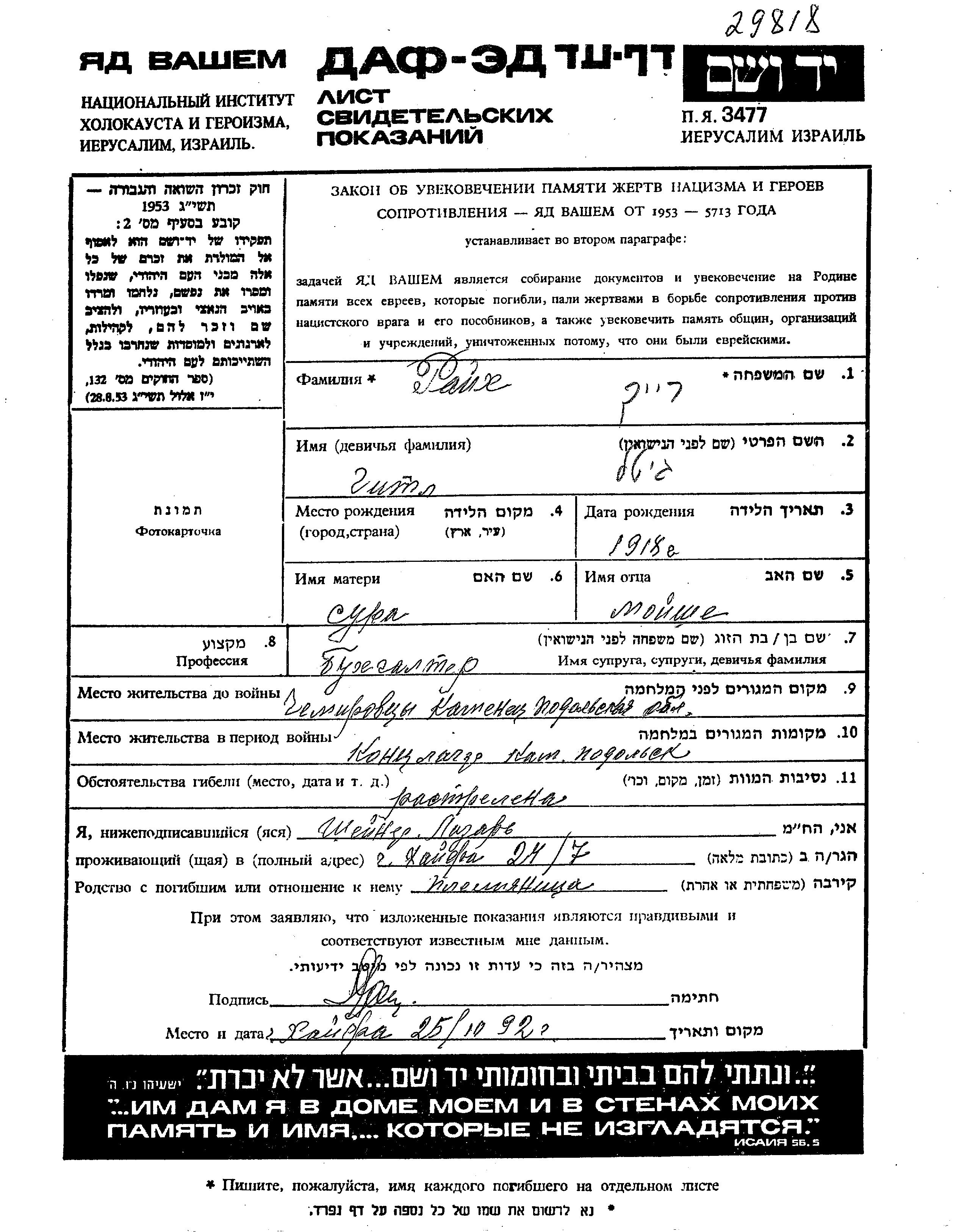 Raikh Gitl 1918 Chemerovtsy, Ukraine (UdSSR) Gedenkblatt