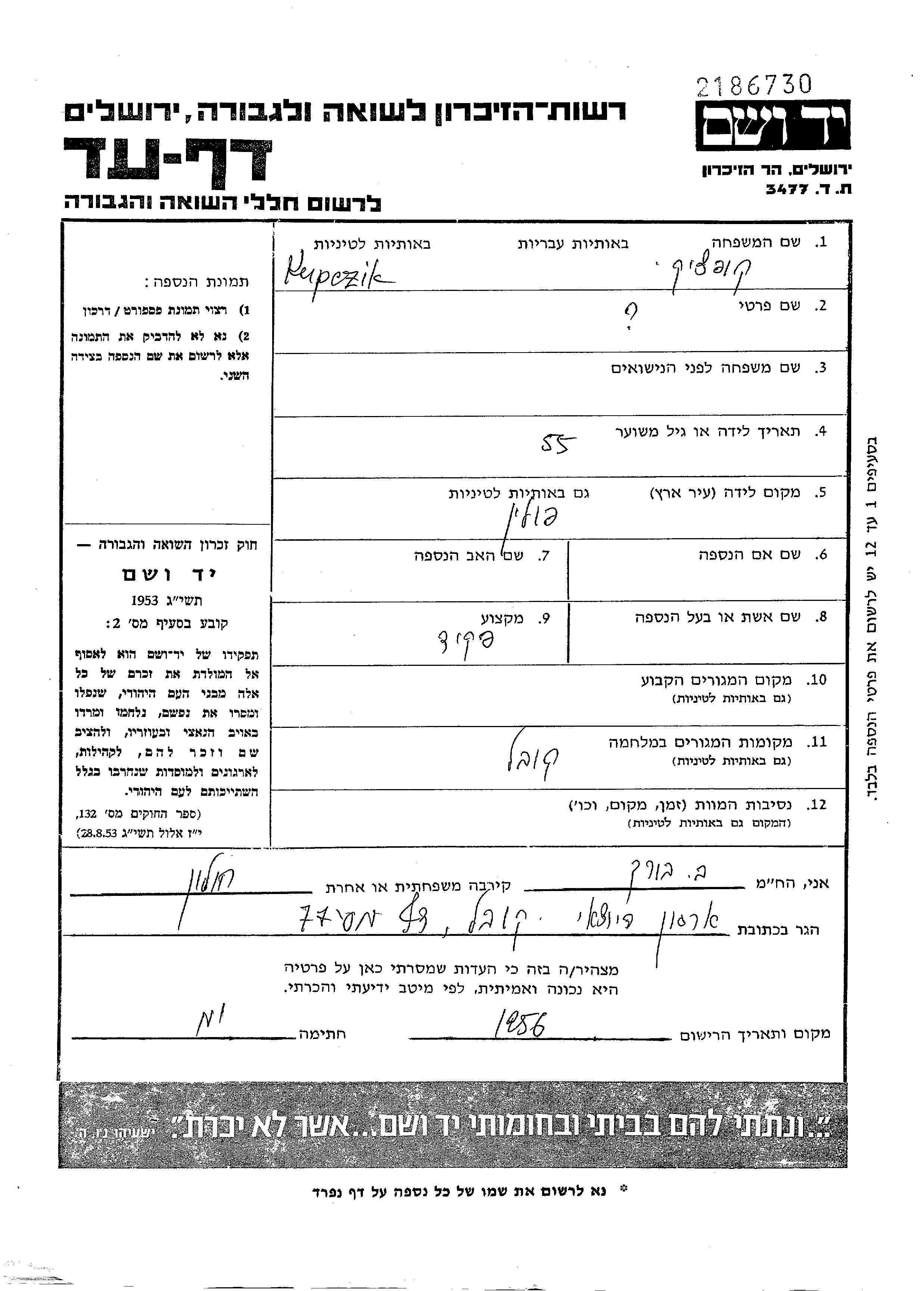 Vorname unbekannt Kupczik Kopchik wurde in Polen geboren. Er war Angestellte/-r. Während des Krieges war er in Kowel, Polen.
