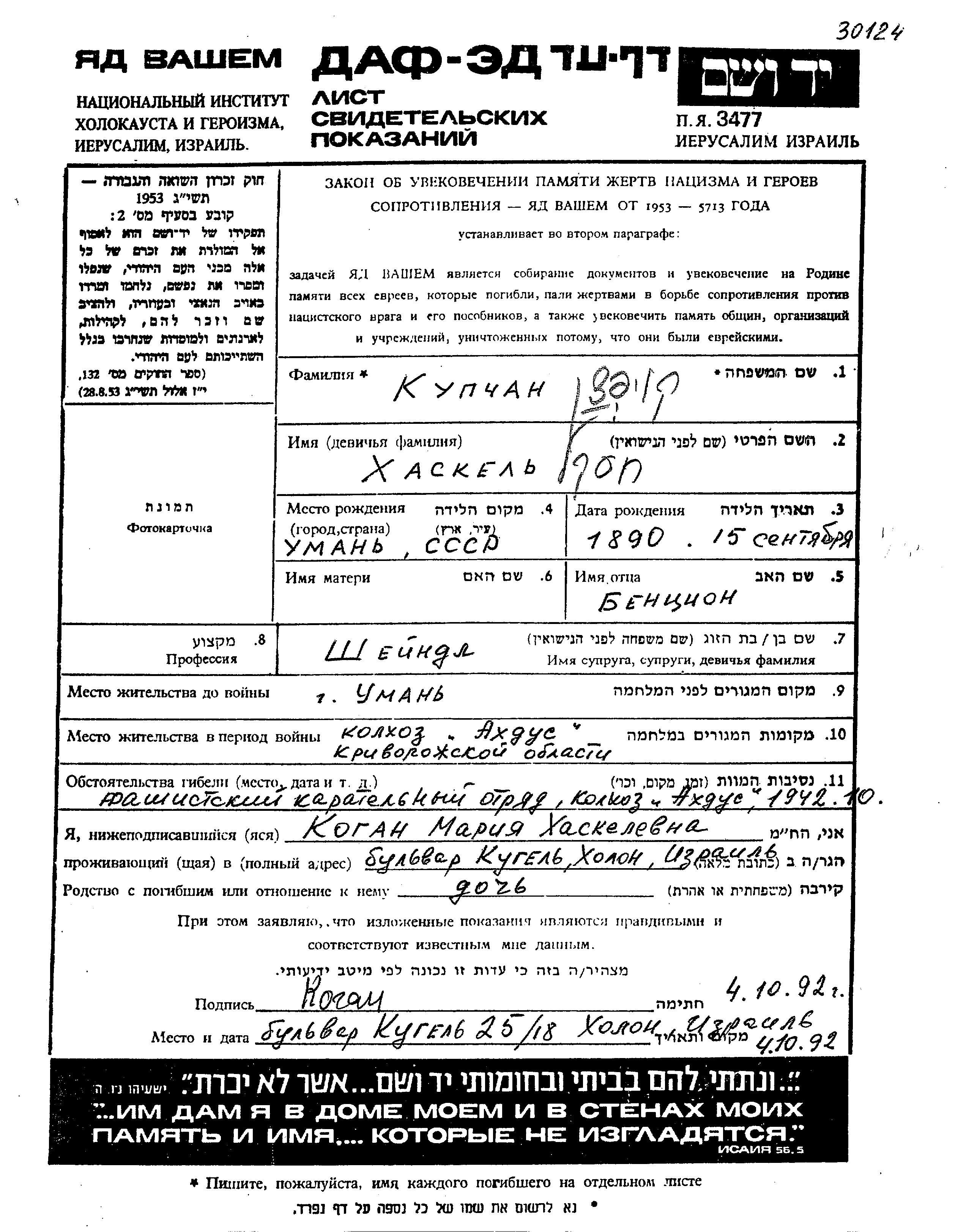 Khaskel Kupchan wurde im Jahr 1890 in Uman, Ukraine (UdSSR) geboren. Er war der Sohn von Bentzion. Er war mit Sheindl Verheiratet. Vor dem Zweiten Weltkrieg lebte er in Uman, Ukraine (UdSSR). Während des Krieges war er in Akhdus, Ukraine (UdSSR).