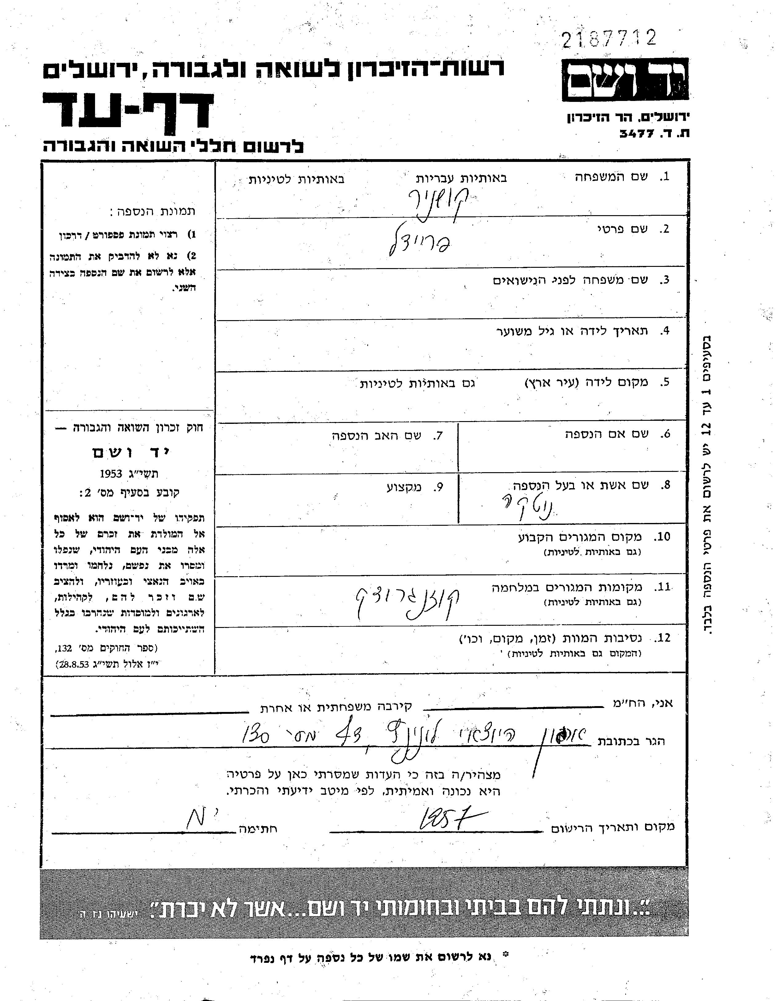 Freidel Kushnir. Sie war mit Nutke Nuta Verheiratet. Vor dem Zweiten Weltkrieg lebte sie in Kożangródek, Polen. Während des Krieges war sie in Kożangródek, Polen.