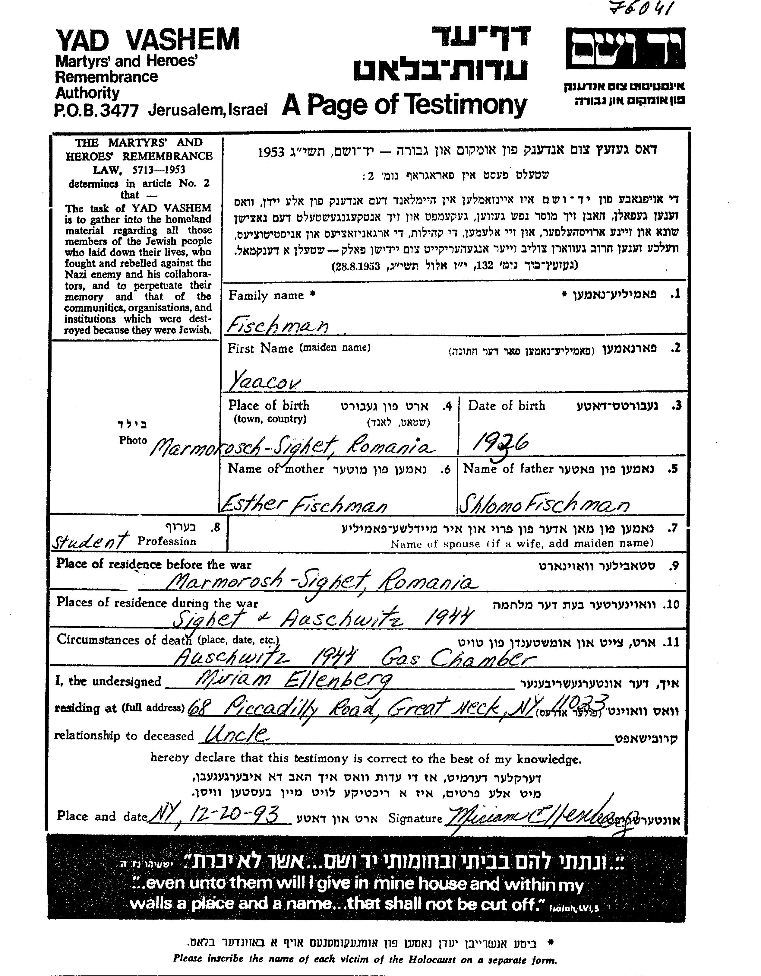 Yakov Fischman wurde im Jahr 1936 in Maramarossziget, Rumänien geboren. Er war der Sohn von Shlomo Mordechai und Esther, geb. Steinmetz. Er war Schüler/-in und Kind. Vor dem Zweiten Weltkrieg lebte er in Maramarossziget, Rumänien. Während des Krieges war er in Maramarossziget, Rumänien.