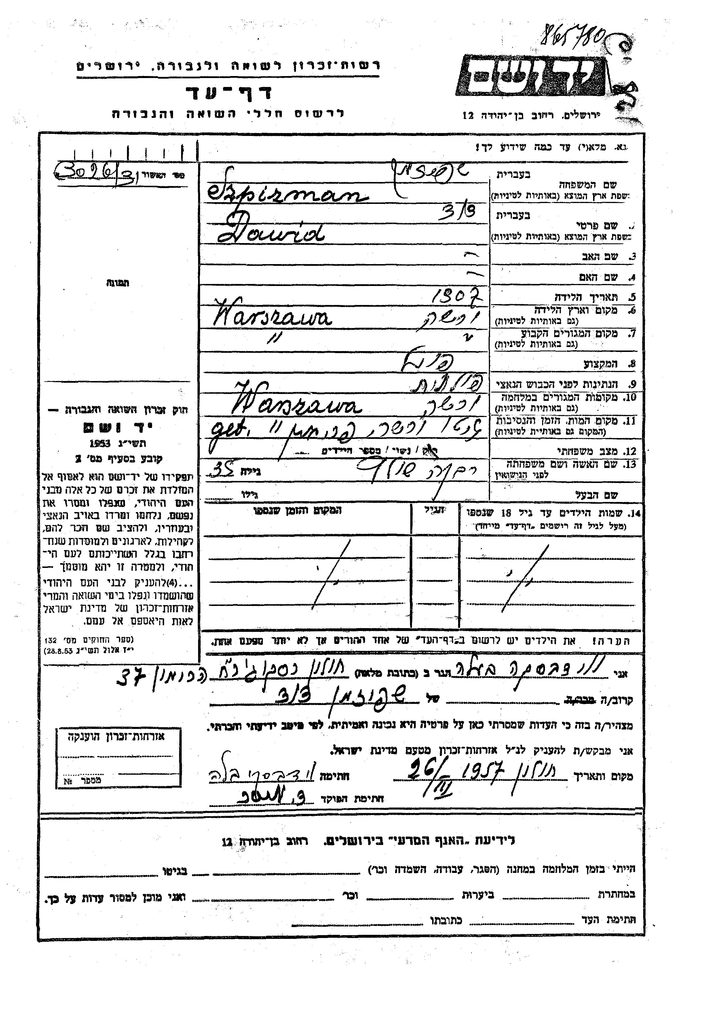 Dawid Szpizman wurde im Jahr 1907 in Varsha, Polen geboren. Er war Arbeiter/-in und mit Rivka, geb. Shultz Verheiratet. Vor dem Zweiten Weltkrieg lebte er in Varsha, Polen. Während des Krieges war er in Varsha, Polen.