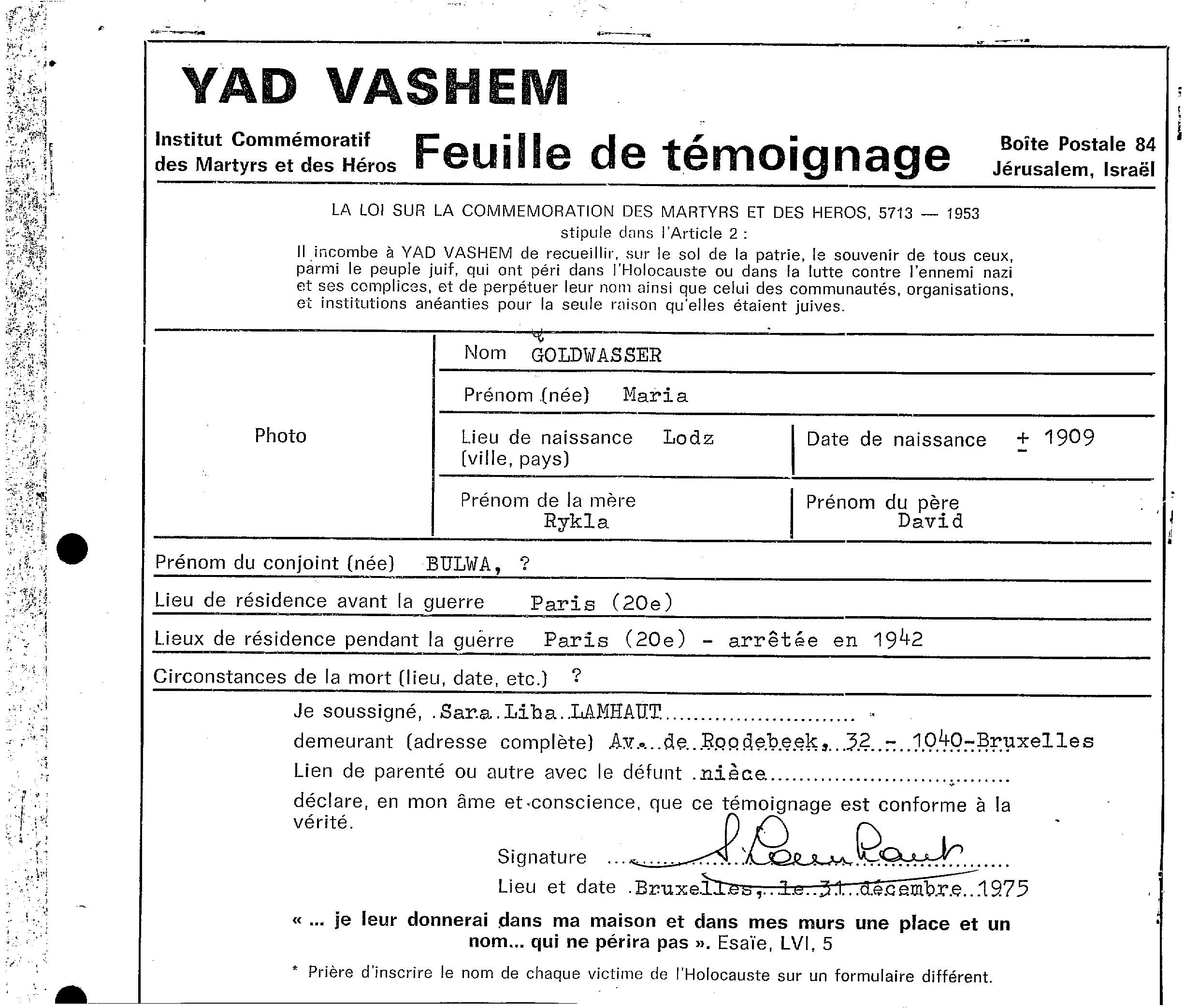 Maria Goldwasser, geb. Bulwa wurde im Jahr 1909 in Lodz, Polen geboren. Sie war die Tochter von David und Rykla. Vor dem Zweiten Weltkrieg lebte sie in Paris, Frankreich. Während des Krieges war sie in Paris, Frankreich.