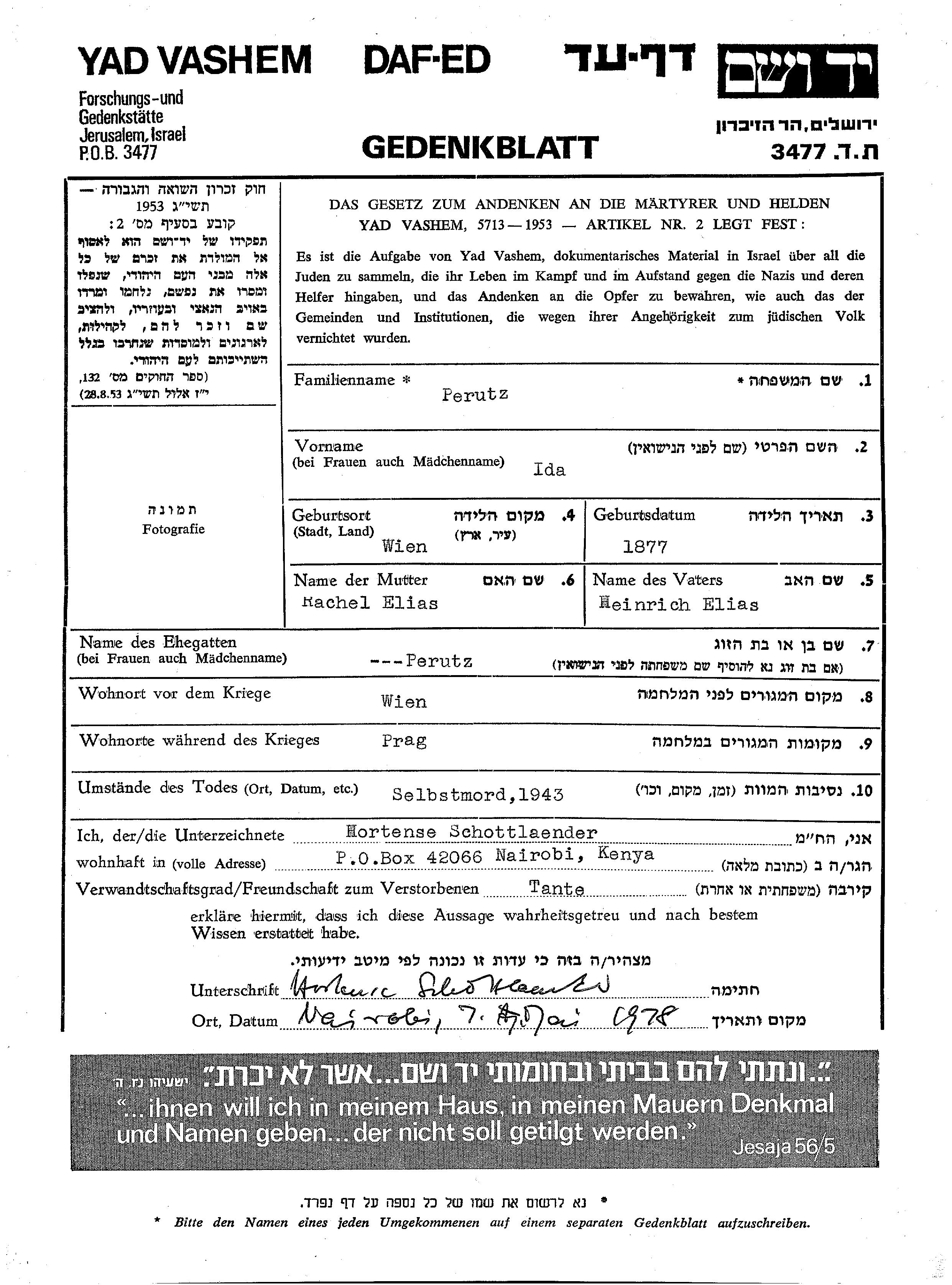 Ida Perutz, geb. Elias wurde im Jahr 1877 in Wien, Österreich geboren. Sie war die Tochter von Heinrich und Rachel. Sie war Verheiratet. Vor dem Zweiten Weltkrieg lebte sie in Wien, Österreich. Während des Krieges war sie in Prag, Tschechoslowakei.