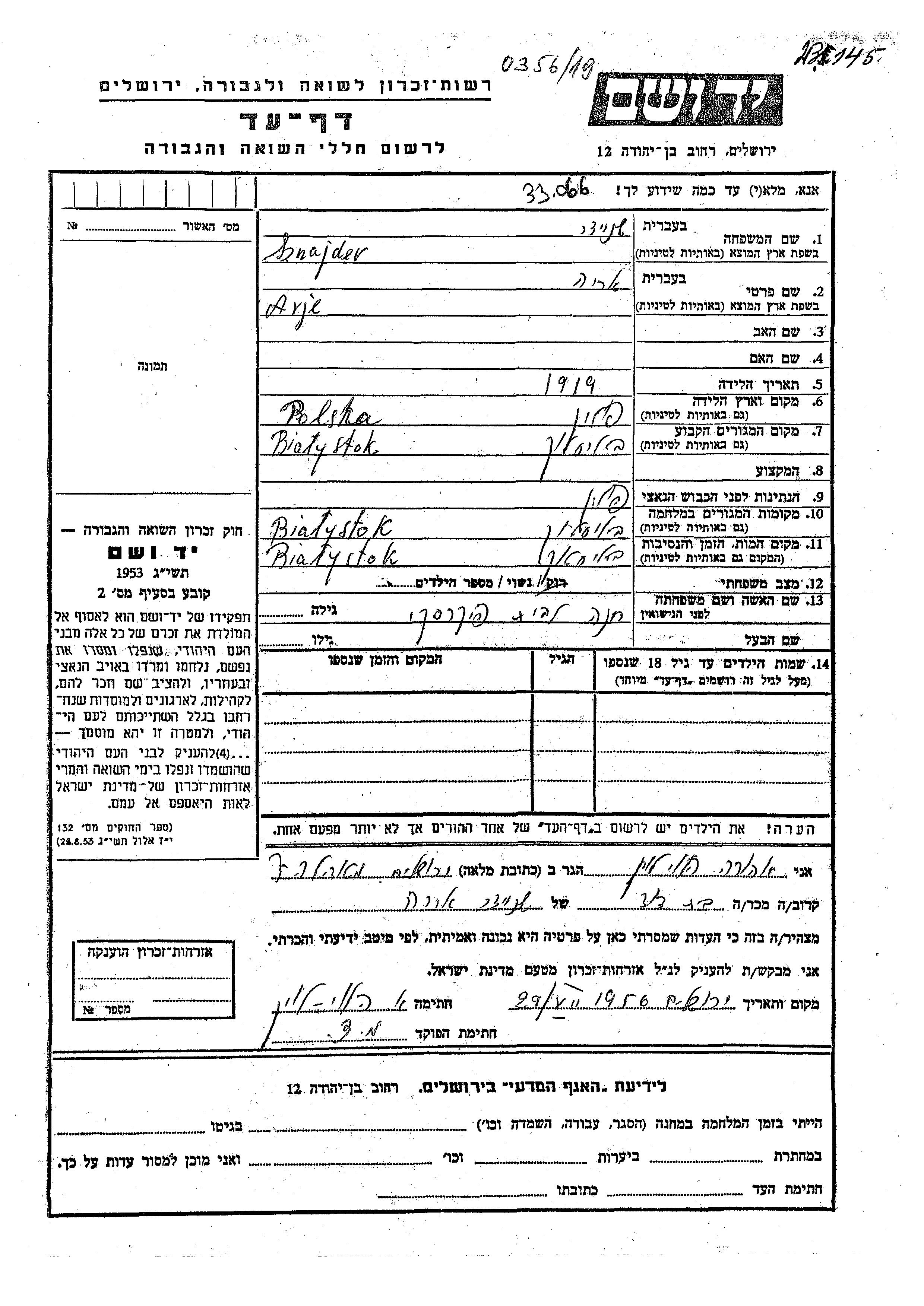 Sznajder Arje 1919 Bialystok, Polen Gedenkblatt